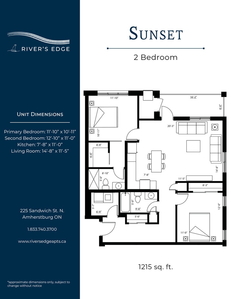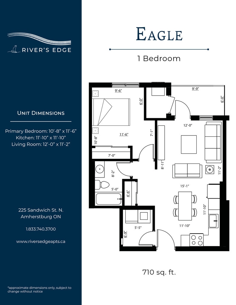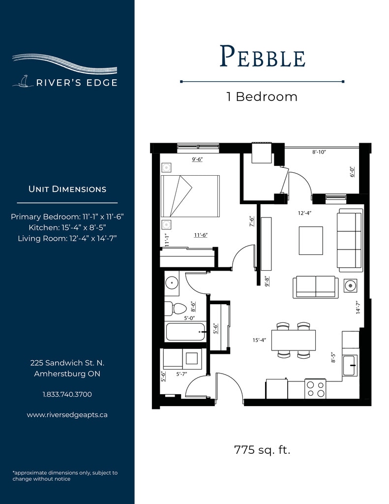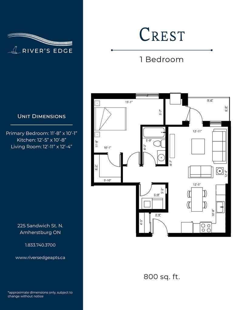 Nestled along the shores of the Detroit River, the most spectacular sunsets can be yours at River’s Edge. Bringing a new level of luxury living to the quaint town of Amherstburg, suites at River’s Edge feature designer finishes, high-end amenities, and river views. All Utilities Included Heat (central air), hydro, and water are all included in your monthly rent. In-Suite Thermostat Control the temperature in your unit with a programmable thermostat. Granite Countertops Granite counters featured throughout each unit in the kitchen and bathroom(s). Washer & Dryer A full-size washer and dryer included in every unit. Electric Vehicle Charging An onsite EV charging station will be available for residents. Golf Simulator Perfect your swing in the golf simulator room! Additional amenities: pet friendly, central A/C, blinds included, upgraded appliances, private balconies, walk-in closets, barrier free units, open concept floor plans, vinyl flooring, secured entry access, walk in showers