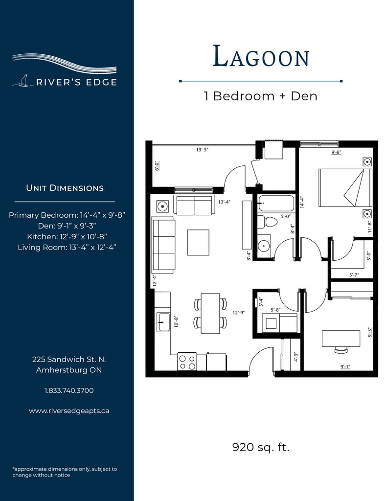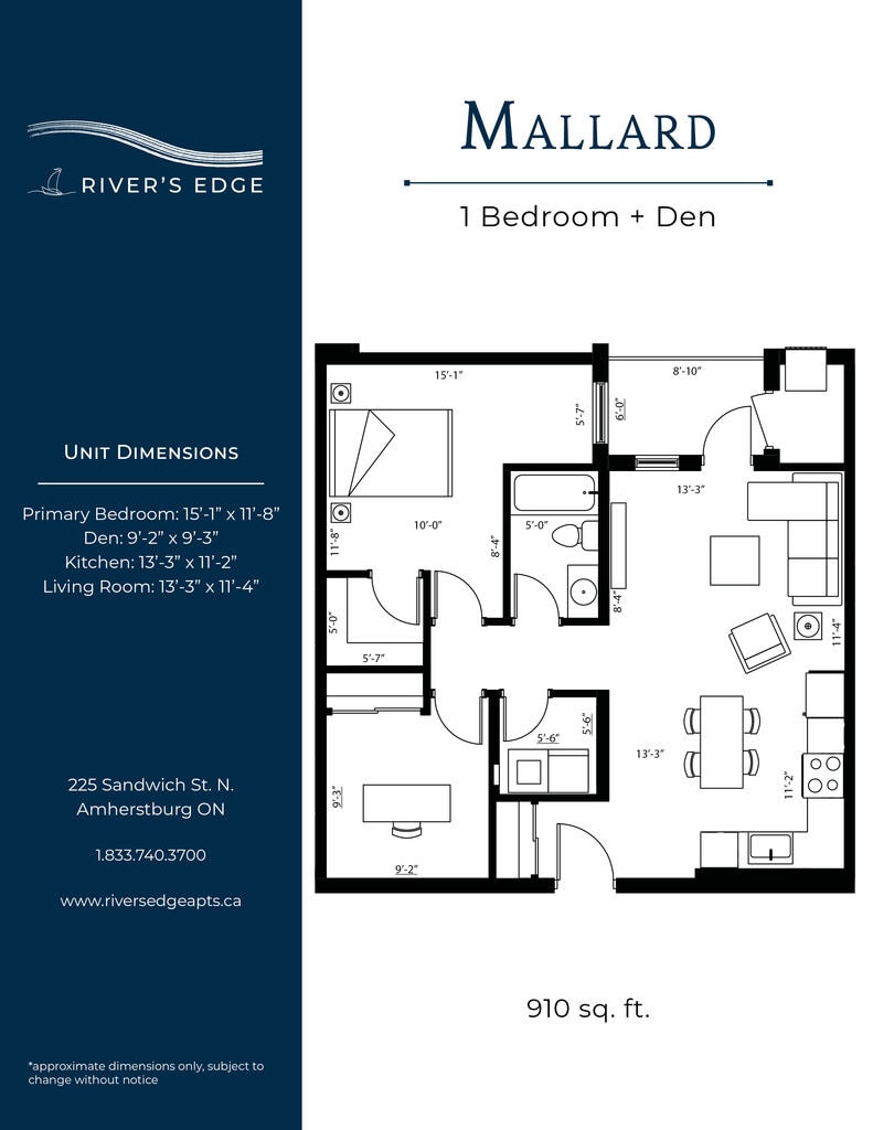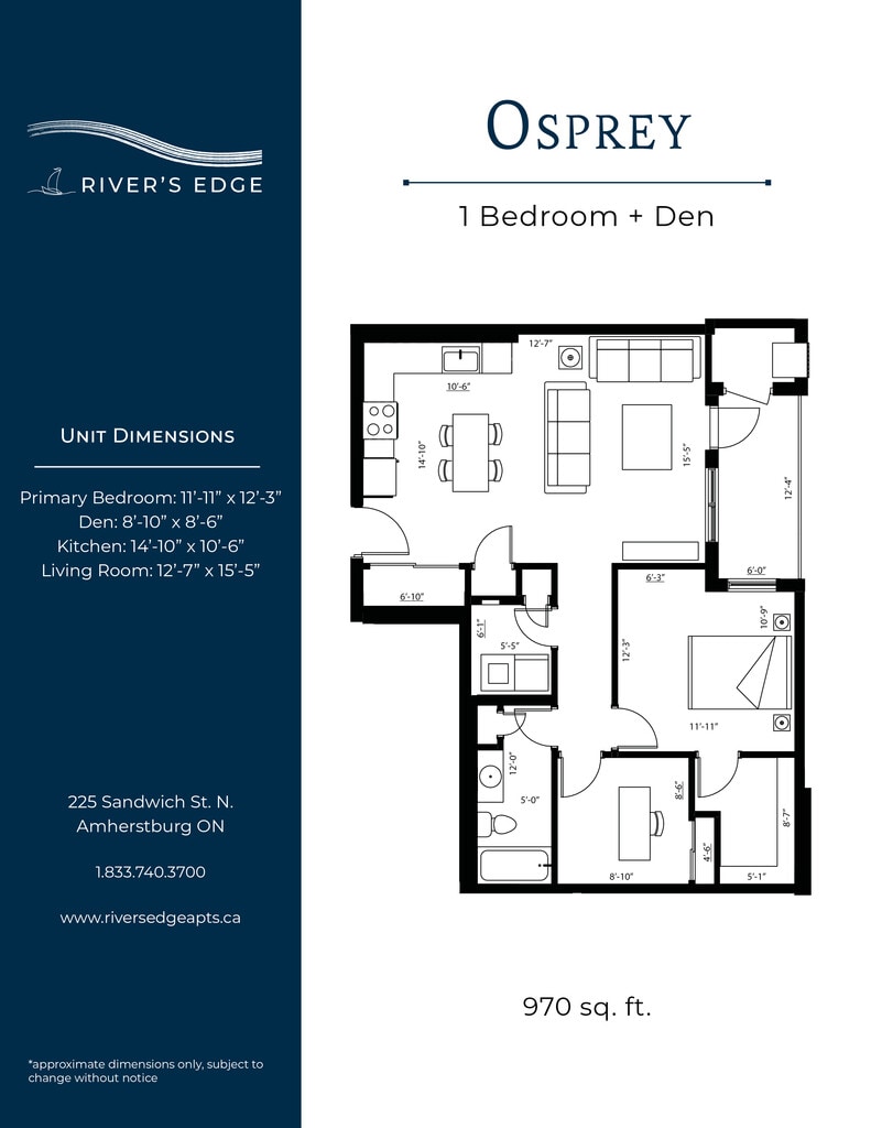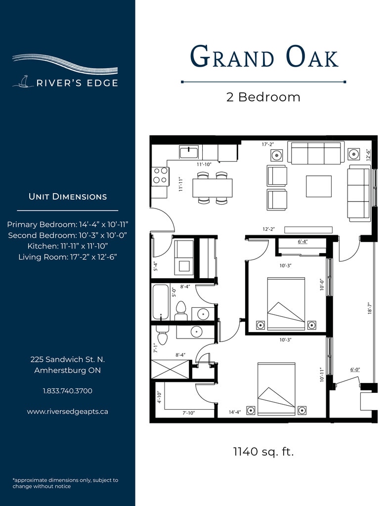 Nestled along the shores of the Detroit River, the most spectacular sunsets can be yours at River’s Edge. Bringing a new level of luxury living to the quaint town of Amherstburg, suites at River’s Edge feature designer finishes, high-end amenities, and river views. All Utilities Included Heat (central air), hydro, and water are all included in your monthly rent. In-Suite Thermostat Control the temperature in your unit with a programmable thermostat. Granite Countertops Granite counters featured throughout each unit in the kitchen and bathroom(s). Washer & Dryer A full-size washer and dryer included in every unit. Electric Vehicle Charging An onsite EV charging station will be available for residents. Golf Simulator Perfect your swing in the golf simulator room! Additional amenities: pet friendly, central A/C, blinds included, upgraded appliances, private balconies, walk-in closets, barrier free units, open concept floor plans, vinyl flooring, secured entry access, walk in showers