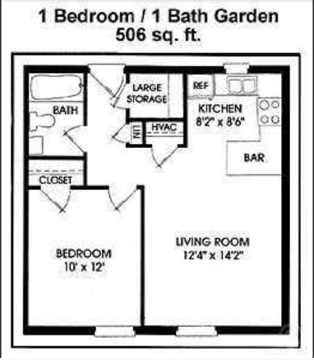 Apartment Model: 1 Bedroom Garden1 Bedroom, 1 Bath, 506 sq ftUnavailable1 Bedroom Garden - Floorplan 1 One Bedroom One Bathroom