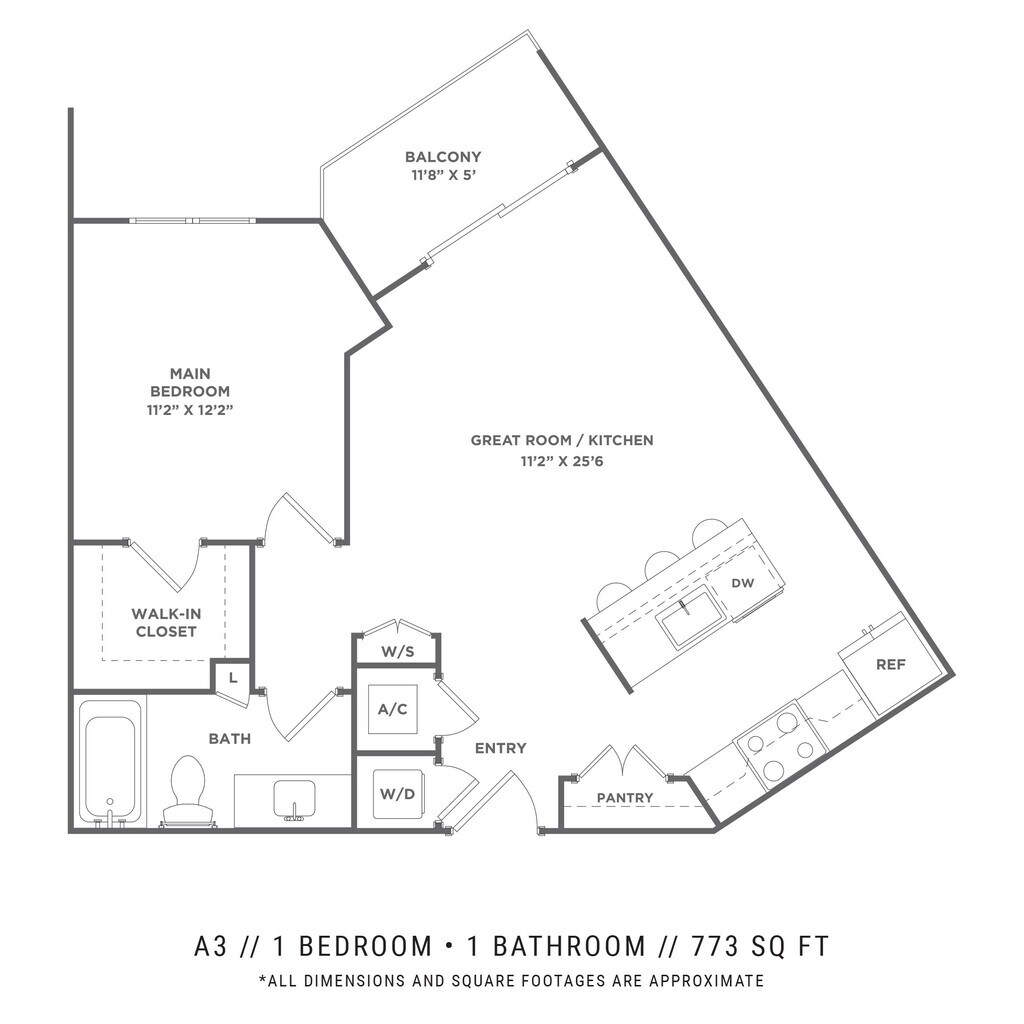 A4 - Floorplan 1 Apartment Unit: 325Apartment Model: A4$2,1501 Bedroom, 1 Bath, 764 sq ftAvailable NowFloorplan A3