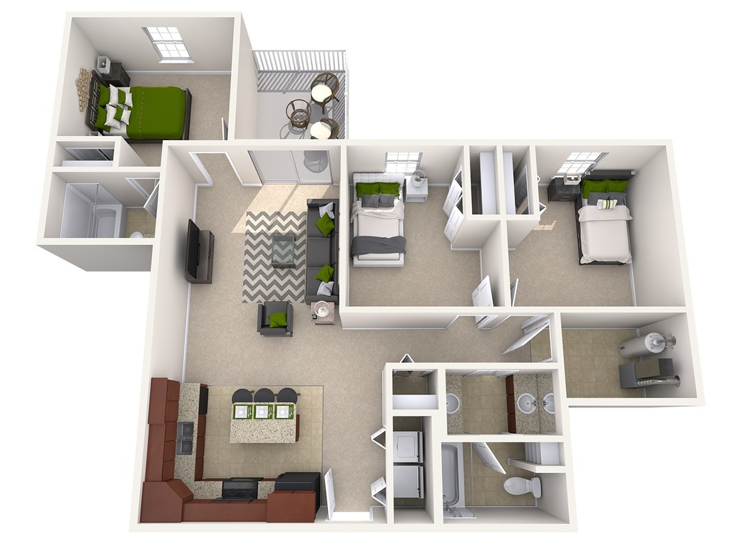 Apartment Model: 3 bed, 2 bath for 3 people3 Bedroom, 2 Bath, 1085-1230 sq ftUnavailable![]()