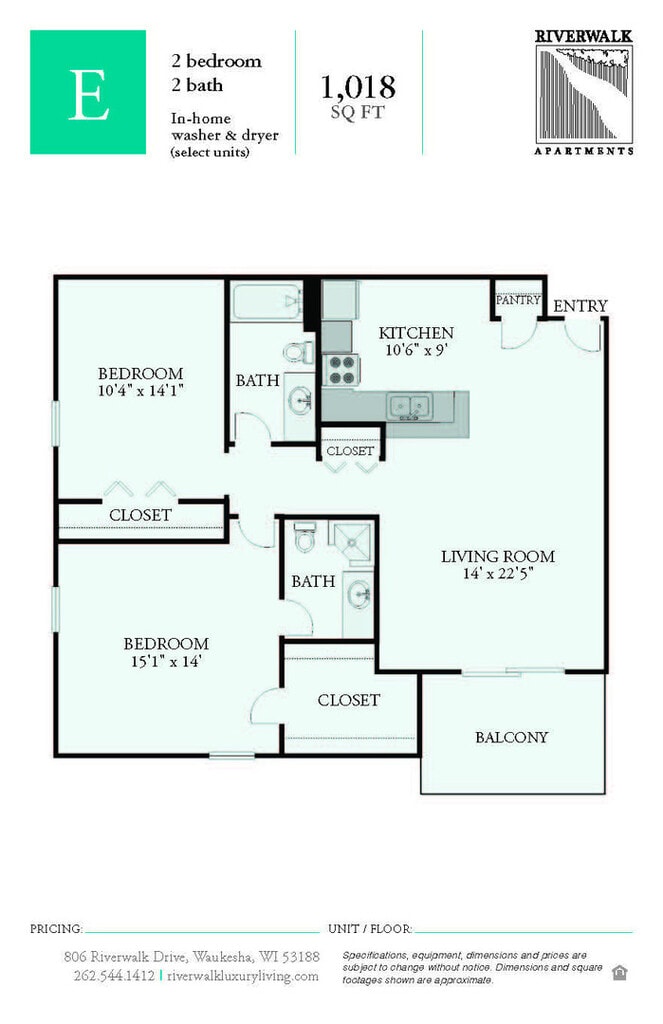 This 2-bedroom/2-bathroom apartment home is a beautiful corner residence with fantastic storage space! Floor Plan E features a spacious layout with an open kitchen and breakfast bar that makes cooking and entertaining a breeze. The adjoining living room is an impressive 14 x 22 feet, offering plenty of room for a dining table or home office set-up! The storage space in this apartment home is sure to impress: a fantastic walk-in closet in the master bedroom, coat closet near the front door, pantry/linen closet in the main living space, and over-sized wall closet in the secondary bedroom. The master bedroom is incredibly spacious, with plenty of room for a king-size bed. The master also features a spacious full bathroom and phenomenal walk-in closet. A large balcony with floor to ceiling glass sliding doors is located off the living room! Plenty of windows to let in lots of light and amazing river views!