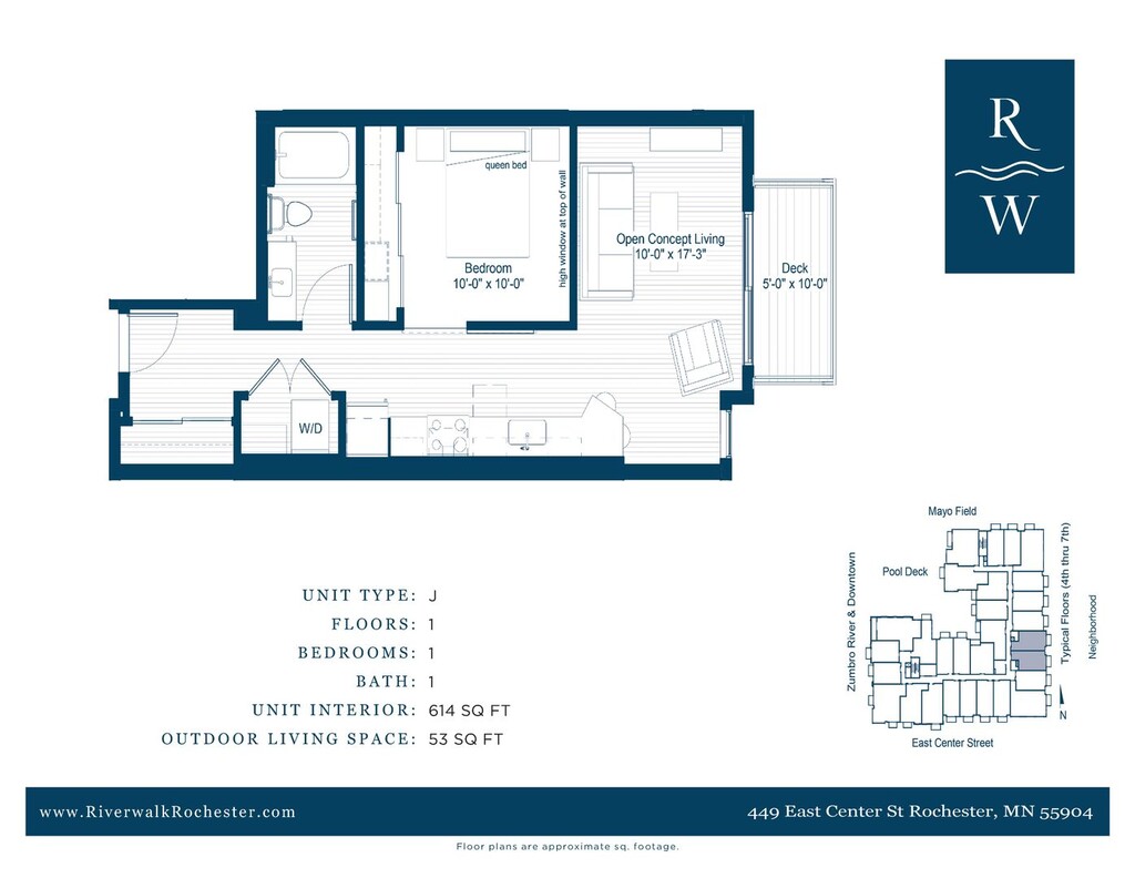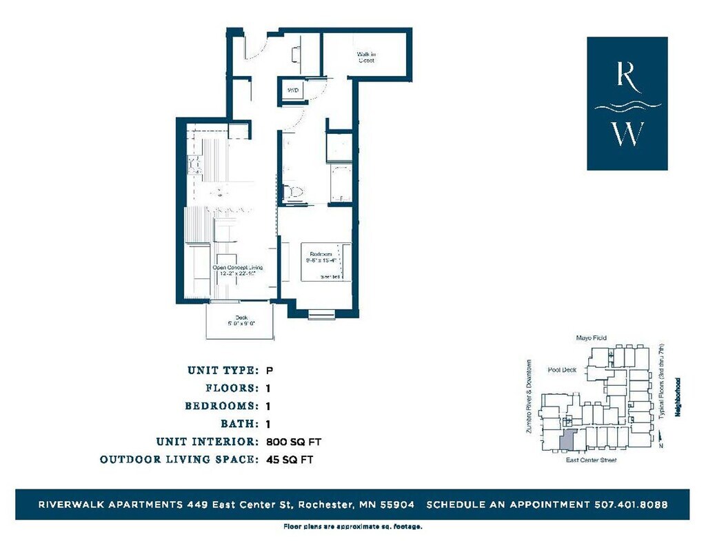 Riverwalk Rochester offers 1 to 2 Bedroom apartments starting from $1,535 and having 596–1,232 sq ft. Here is the current pricing and availability: