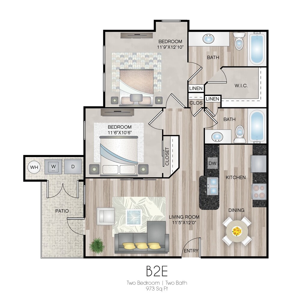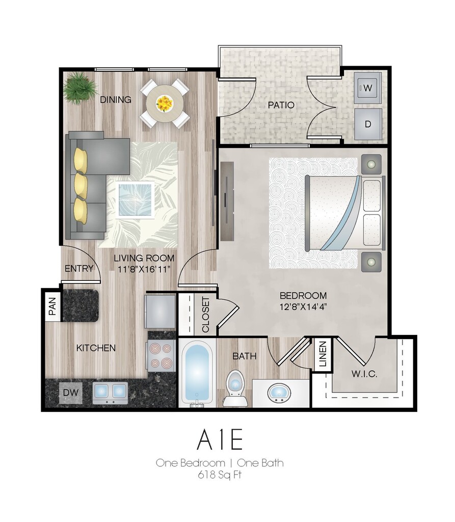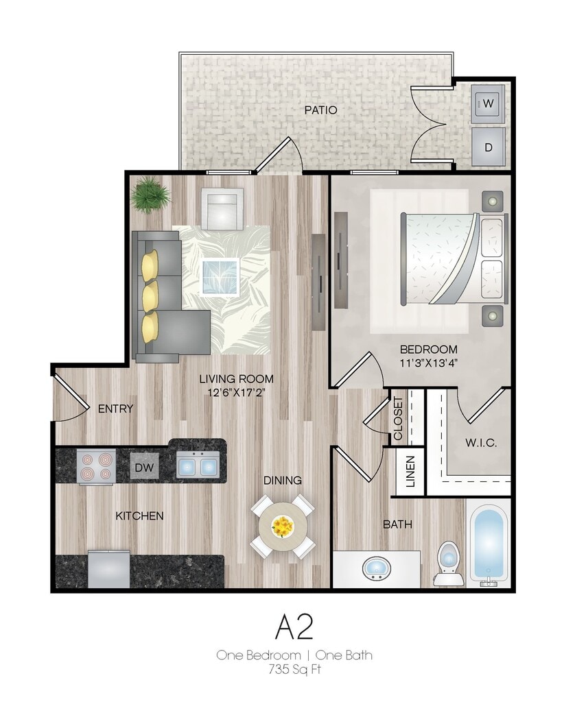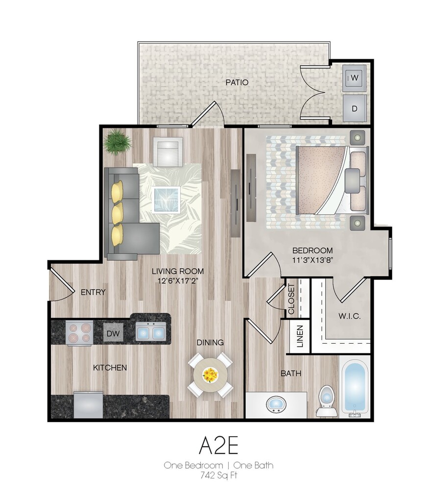 Apartment Model: A2E - 1x1From $1,0301 Bedroom, 1 Bath, 742 sq ftAvailable NowFloor plans are artist's rendering. All dimensions are approximate. Actual product and specifications may vary in dimension or detail. Not all features are available in every rental home. Prices and availability are subject to change. Base rent is based on monthly frequency. Additional fees may apply, such as but not limited to package delivery, trash, water, amenities, etc. Deposits vary. Please see a representative for details.