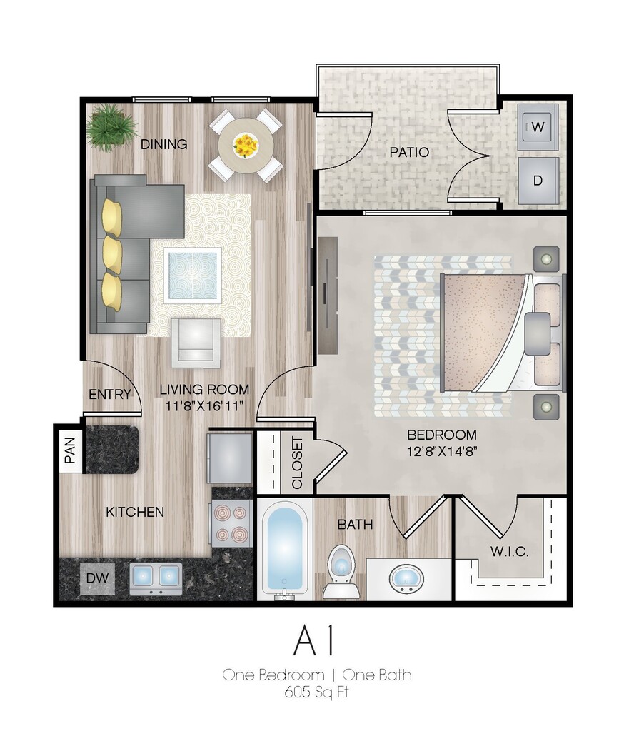 1 Bed, 1 Bath, 605 sq ftAvailable NowModel Gallery