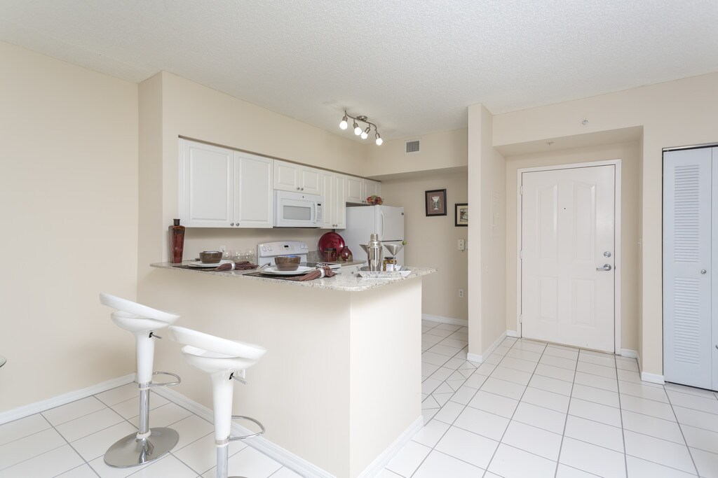 - Granite/Quartz Countertops with Modern, White European-Style Cabinetry With Self-Closing Hinges