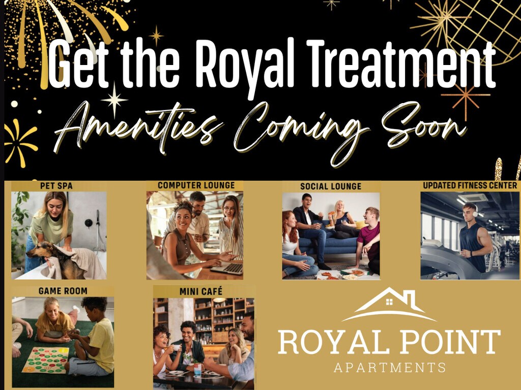 The current rent special at Royal Point Apartments is: HARVEST GREAT SAVINGS WHEN YOU CHOSE THE ROYAL TREATMENT!!~~MAKE ROYAL POINT YOUR NEW HOME! BRING YOUR FUR FAMILY - NO SIZE OR BREED RESTRICTIONS!! FREE RENT PLUS LOOK AND LEASE SPECIALS!!! NEW PREFERRED EMPLOYER DISCOUNTS. CLUBHOUSE RENOVATION ALMOST COMPLETE, BE ONE OF THE FIRST TO ENJOY OUR NEW AMENITIES!!! CALL TODAY WHILE WE STILL HAVE UNITS AVAILABLE..