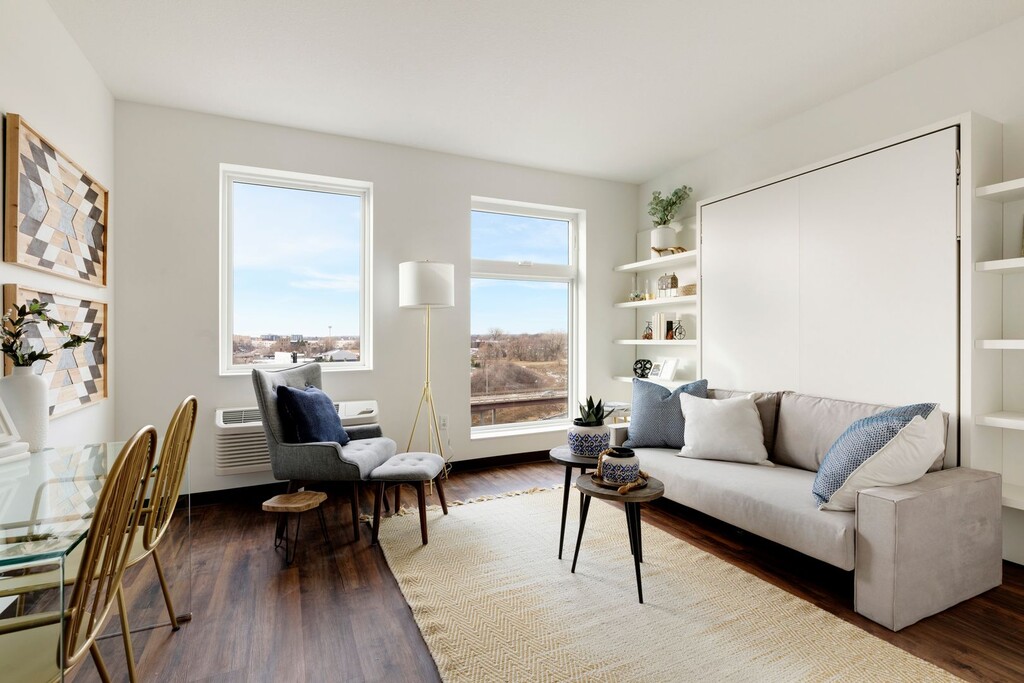 *Offer valid on lease terms of 13 months or longer. Third month’s rent must be paid in advance* Located in the thriving maker’s corridor of Minneapolis, Rym delivers the choices you need to live the life you want—including a variety of unique floor plans to choose from! Rym is designed to reflect the creativeness of this historic maker’s neighborhood in Minneapolis. You’ll see fun touches throughout the building that bring the vibrancy of the neighborhood indoors! Rym Offers both furnished and unfurnished studio units. Each apartment features 9 – foot ceilings, expansive windows, app-based controls and out-the-door access to your own, custom-made Minneapolis lifestyle. Feel the burn in our on-site 24/7 Fitness Center with virtual personal training. Hang out with Friends in the community lobby or pedal around to the many parks, pubs, shops and eateries of Beltrami, Como and Marcy Holmes neighborhoods. At Rym, life doesn’t follow any blueprint – except your own. Apartment Features: Quartz Countertops High Ceilings Oversized Windows Luxury Vinyl Flooring Soft Close Cabinetry Convertible Furniture (queen bedframe, mattress, shelving) SMART Light switches Stainless Steel Appliances In Unit Washer/Dryer Pet Friendly Building Features: Co-Working Lobby Conference Room Indoor Bike Lounge App-Based Fitness Center with Virtual Personal Training Car Charging Stations Off Street Parking Easy Access to Transit Easy Access to 35W & University of Minnesota $500 Deposit Pet Fees: $250 Non-Refundable Pet Deposit $250 Refundable Pet Deposit $50/month Pet Rent