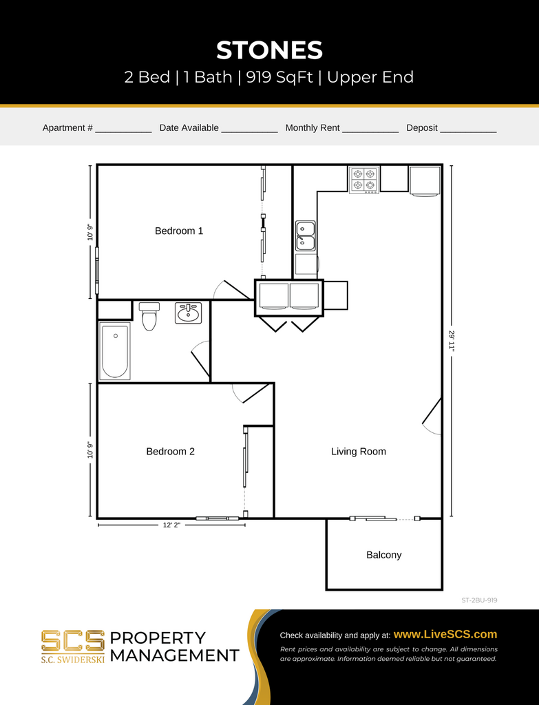 Apartment Model: Stone 2 BR Upper2 Bedroom, 1 Bath, 919 sq ftAvailable November 7, 2025FloorplansPhotos![]()