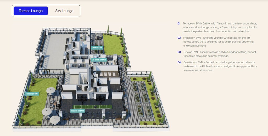 SVNTY offers Studio to 3 Bedroom apartments starting from $2,140 and having 428–1,324 sq ft. Here is the current pricing and availability: