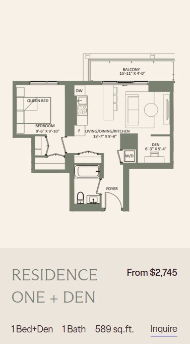 Price Availability Date Unit Sq Ft From $2,705 Available Now 1 Bedroom + Den 589 sq ft Model Amenities and Features