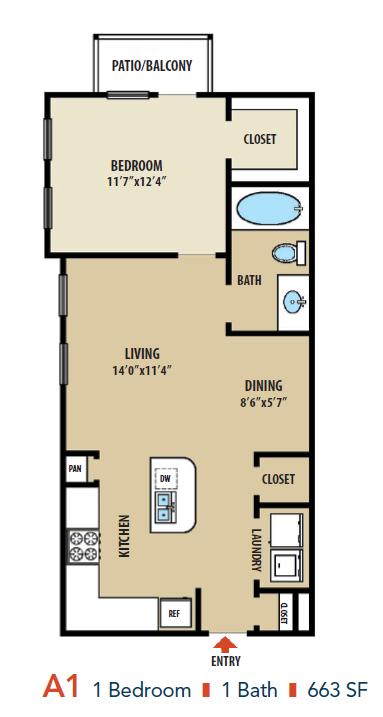 Apartment Model: A1From $1,1651 Bedroom, 1 Bath, 663 sq ftAvailable NowFloorplansPhotos![]()