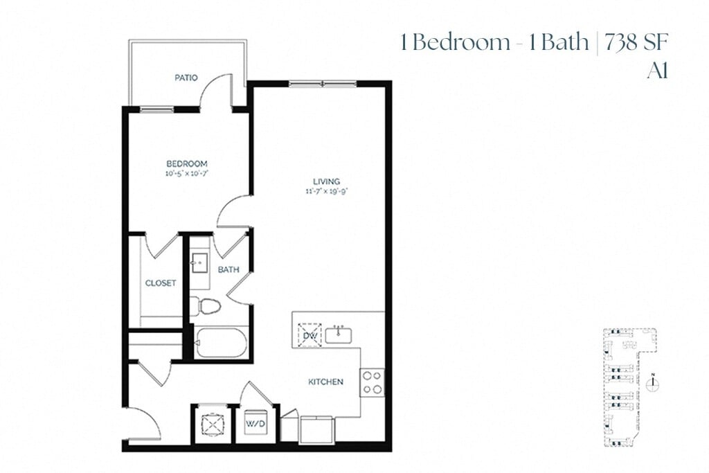One Bedroom A1 - Floorplan 1 Apartment Unit: 4-109Apartment Model: One Bedroom A1Call For Rates1 Bedroom, 1 Bath, 738 sq ftAvailable NowApartment Unit: 9-109Apartment Model: One Bedroom A1$1,6951 Bedroom, 1 Bath, 738 sq ftAvailable Now![]()