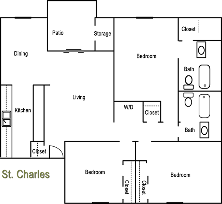 Apartment Model: St. CharlesFrom $9003 Bedroom, 2 Bath, 1200 sq ftAvailable NowSt. Charles - Floorplan 1