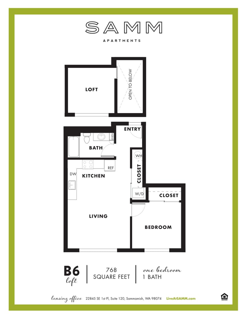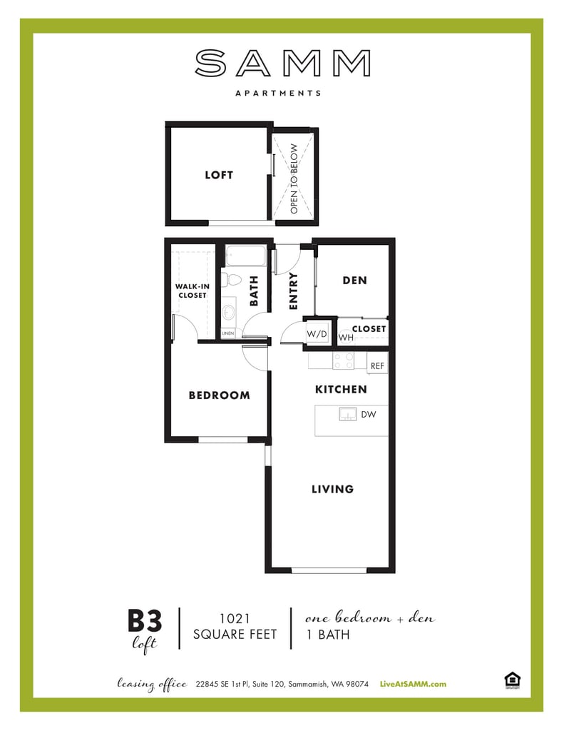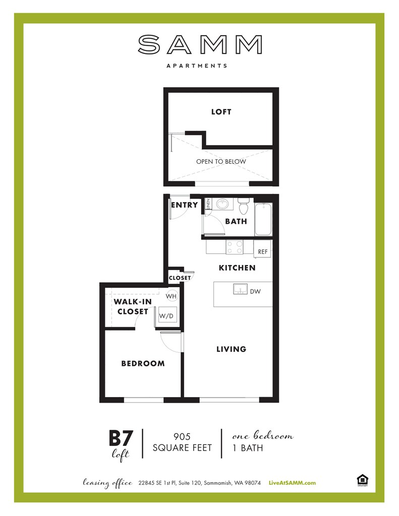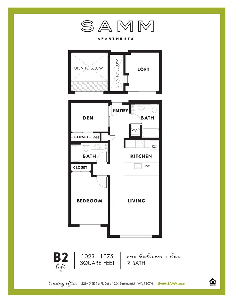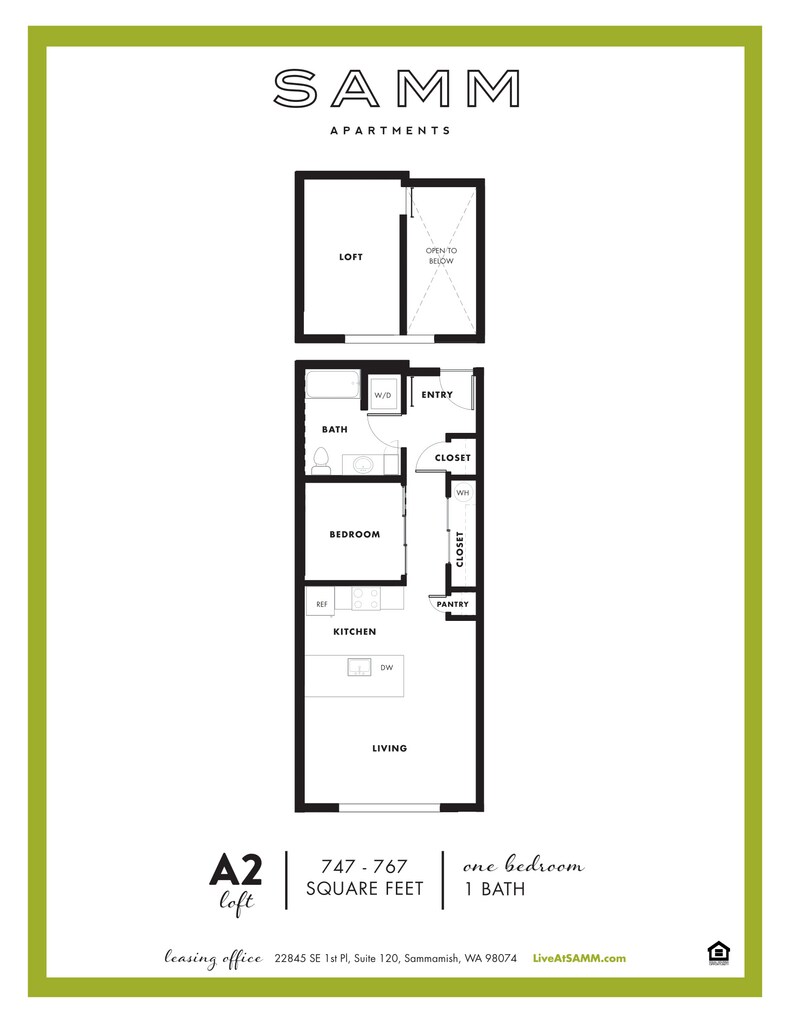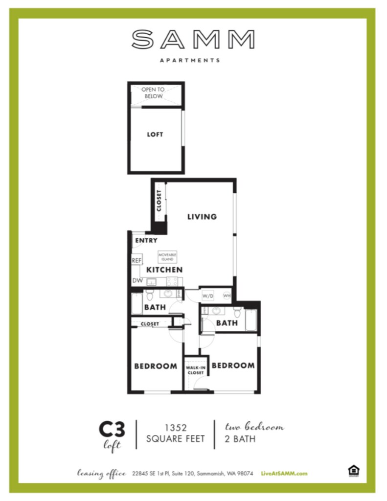 Welcome to SAMM Apartments, where residents can truly live! We offer brand-new, spacious studio, one, and two-bedroom apartment homes, located across the street from The Village at the Sammamish Town Center! Inside youll find luxurious features like open floor plans, quartz countertops, spacious closets, dens, lofts and so much more. Residents can work or lounge in the large amenity areas, play a game of ping pong on the patio with friends, get active in the fitness center, or take in the sunset on the rooftop deck around the fireplace. Find the home that fits your lifestyle at SAMM.
