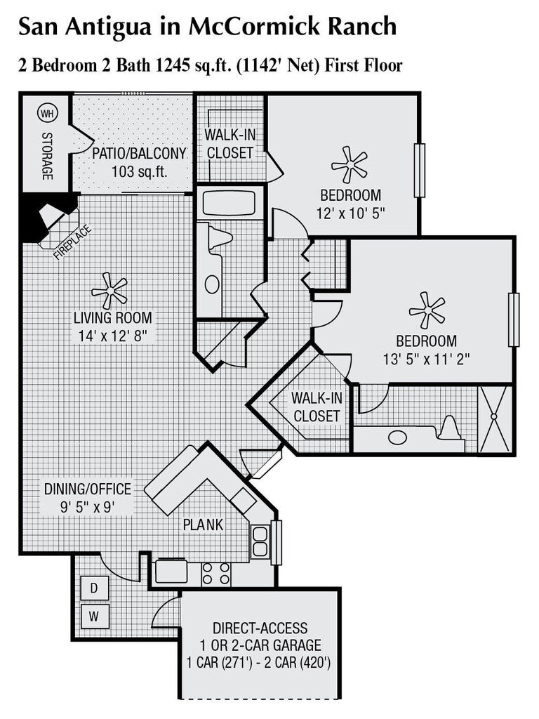 1 Bed 1 Bath 1-car Garage 929 SqFt (845 Net) - Floorplan 3 2 Bedrooms