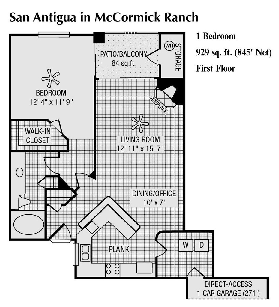 1 Bed 1 Bath 1-car Garage 929 SqFt (845 Net) - Floorplan 1 ![]()