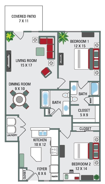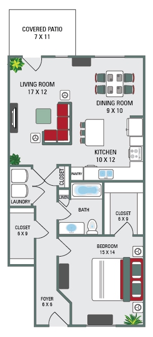 Apartment Model: 1 Bed - 939 Sq ftFrom $1,3101 Bedroom, 1 Bath, 939 sq ftAvailable Now![]()