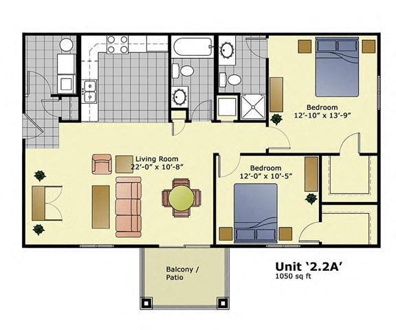 Apartment Model: Unit 2.2ACall For Rates2 Bedroom, 2 Bath, 1050 sq ftUnavailable![]()