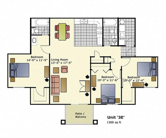3 Beds, 2 Baths, 1300 sq ftLargest 3 BedroomThis is the largest 3 Bedroom at this PropertyModel Gallery