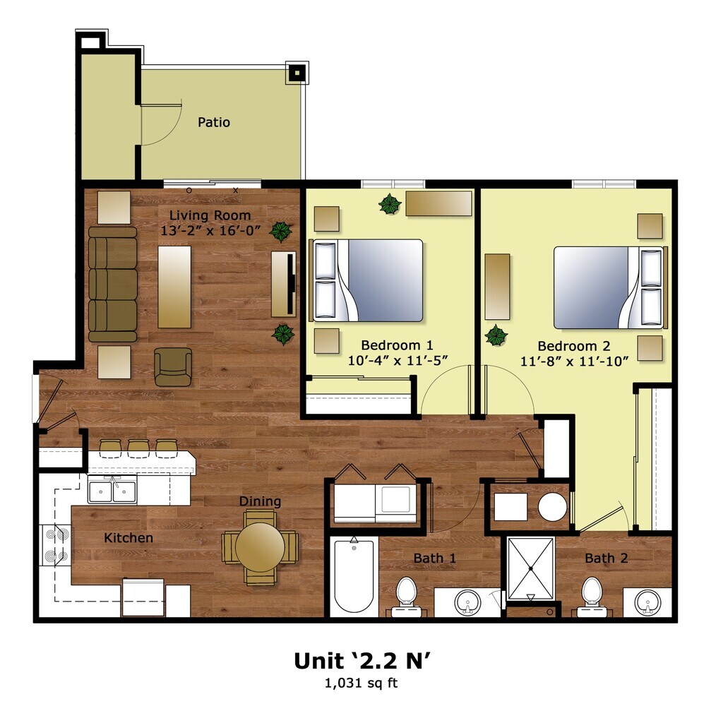 Apartment Model: Unit 2.2NCall For Rates2 Bedroom, 2 Bath, 1031 sq ftUnavailableFloorplansPhotosUnit 2.2N - Image 1 Unit 2.2N - Floorplan 2 3 Bedrooms