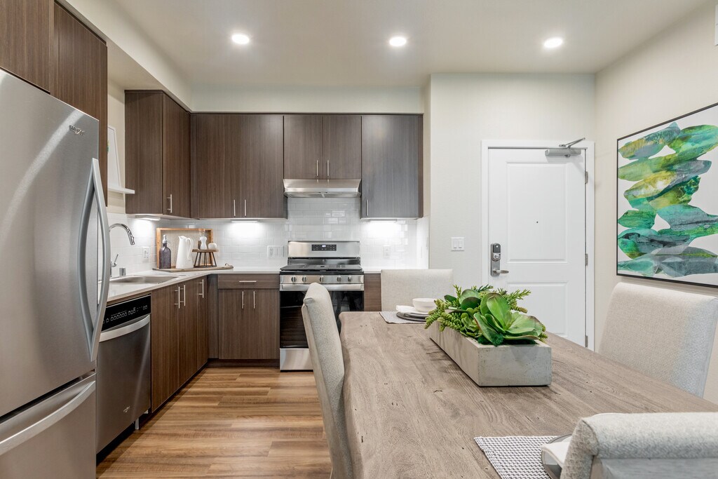 Featuring a contemporary design with an abundance of amenities, Santana Terrace represents the ultimate standard for luxury apartment living in Silicon Valley. The community offers open-concept one- and two-bedroom homes with stainless steel appliances, hardwood-style flooring, modern cabinetry, quartz countertops with tile backsplashes, energy-efficient heating and air conditioning, in-unit washer and dryer, keyless entry system, and private balconies with storage.