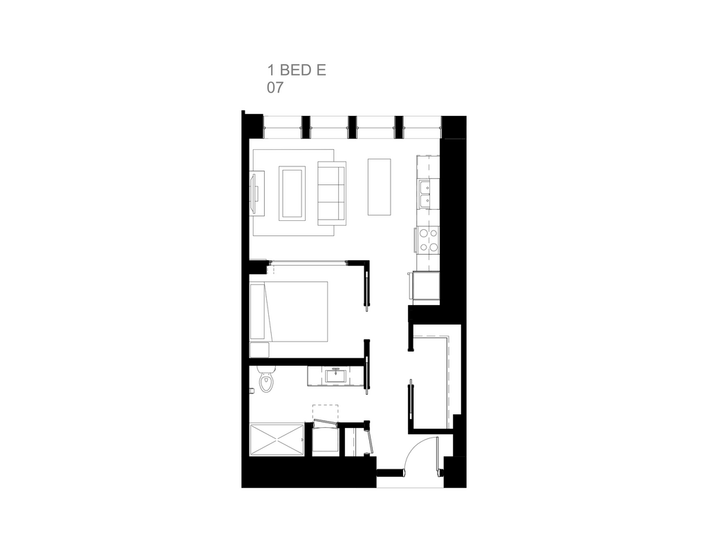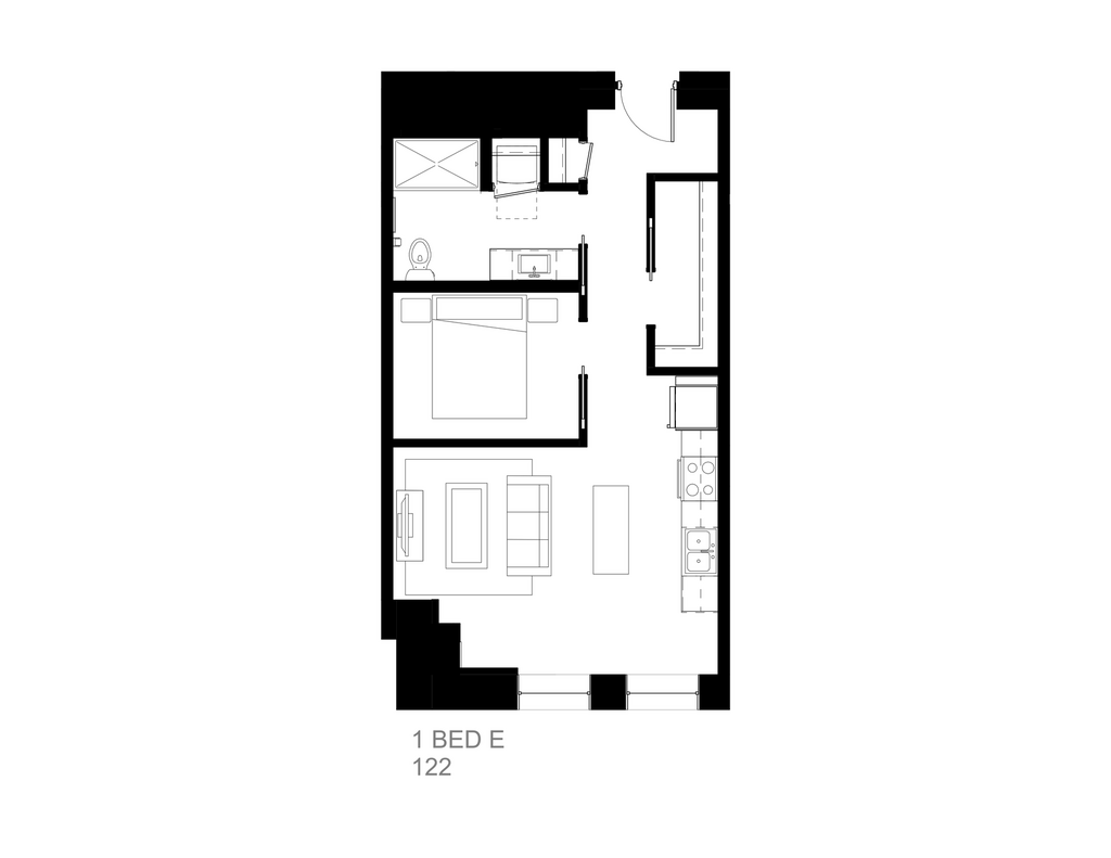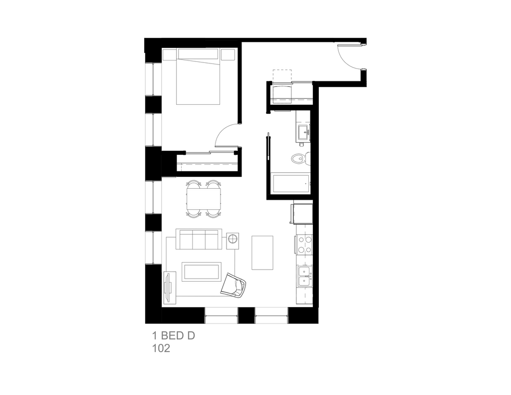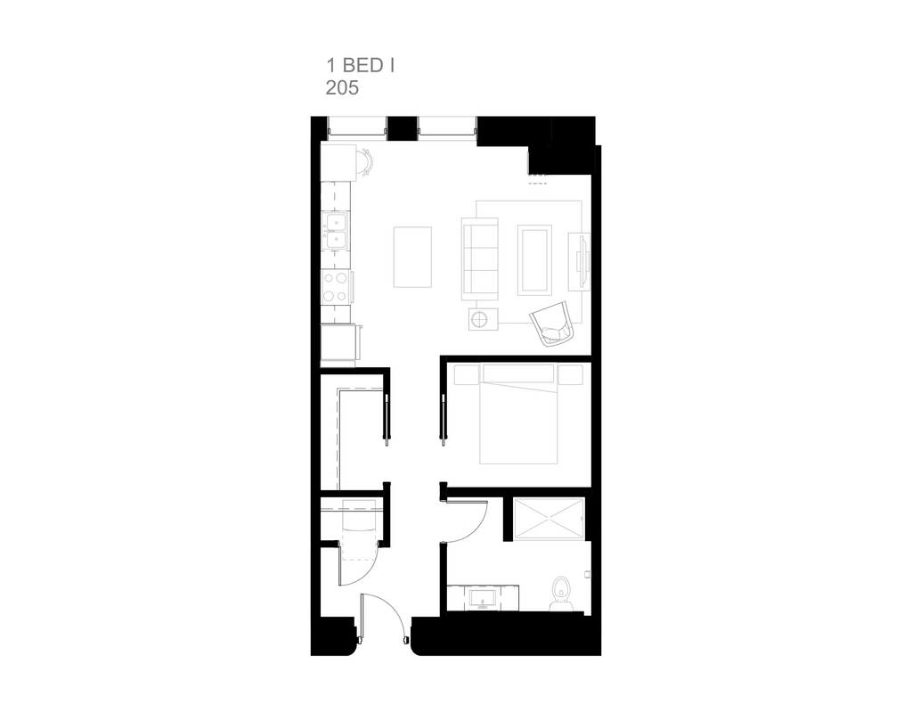 This one-bedroom residence offers an open and versatile floor plan in the heart of Duluth, MN. The living area is spacious and well-proportioned, with room for a full seating arrangement and a dedicated reading or lounge chair — a flexible space that adapts easily to everyday life. The kitchen runs alongside the living area with ample counter and cabinet space, a range, and a refrigerator, staying naturally connected to the heart of the home. The bedroom is a comfortable and private retreat, well-separated from the living space and easily accommodating a full furniture set. A closet and bathroom are conveniently positioned nearby, and a washer/dryer closet is neatly tucked off the entry. An open, adaptable living space, a well-equipped kitchen, and a private bedroom retreat — this one-bedroom residence is a comfortable and inviting home at Zenith.