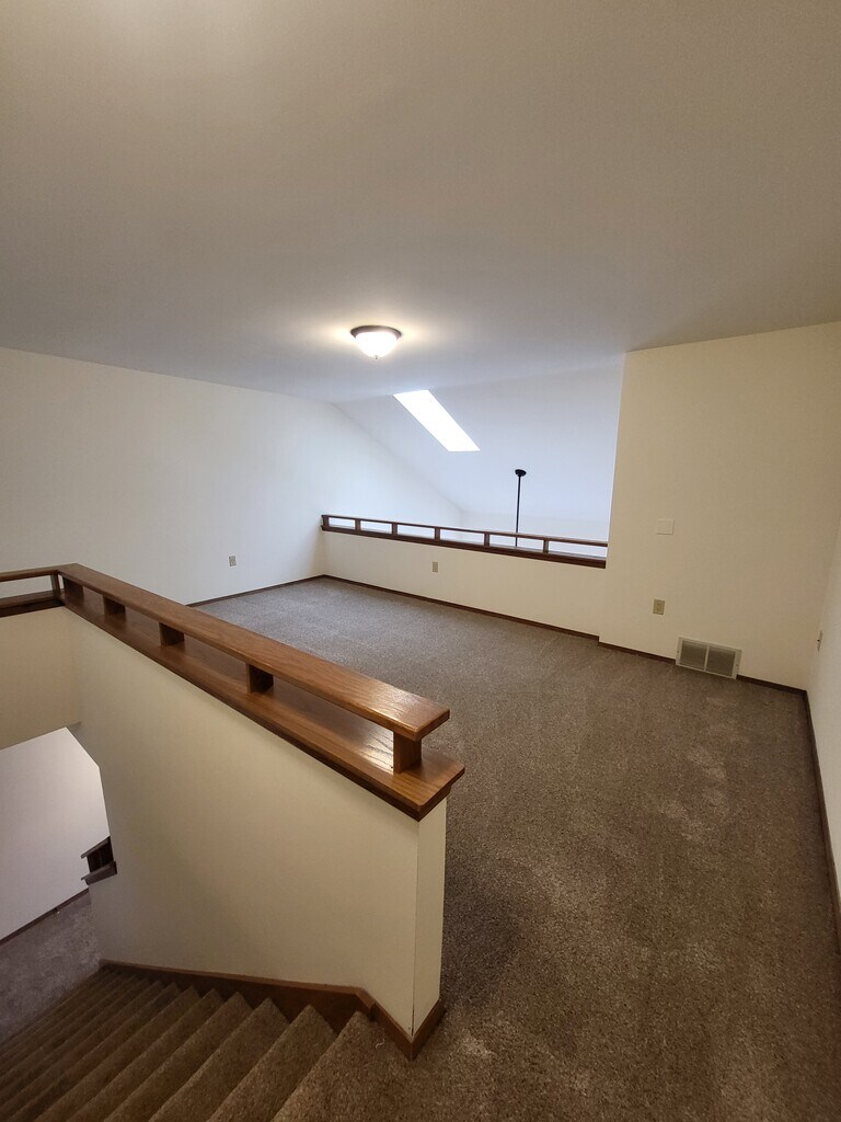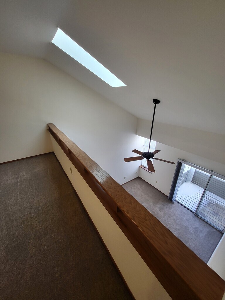 Vaulted ceilings, ample light from large windows and skylight. In-unit washer/dryer, private balcony, and huge closets and storage.