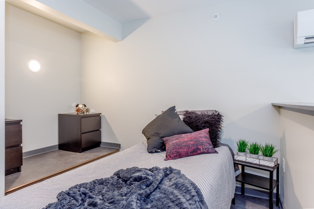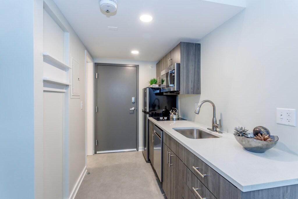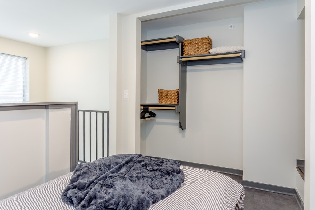 Scholars Row offers loft style studio apartments unlike any other in Kansas City! Modeled after Singapore’s acclaimed ultra-efficient hotels, Scholars Row provides the affordability of a studio apartment with the perks of a traditional one bedroom loft. Kitchens at Scholars Row are fully equipped with a stainless steel-like refrigerator, glass cooktop, convection microwave oven, garbage disposal, and even a dishwasher. Our gorgeous bathrooms exceed many standard studio apartments by featuring a full-size vanity with storage, a full bathtub, and elegant comforts like a curved shower rod. Queen sized bedroom furniture fits well atop the mezzanine loft, and you will find plenty of space in the large, expansive closet. With our easy and affordable bundled utility rate, choosing to live at Scholars Row means all your utilities including electricity and WIFI internet access are all covered with one fixed payment each month. Our pet policy is among the most accommodating in Kansas City as cats and dogs of all sizes are welcome. Newly built and unique to Kansas City, our loft style studio apartments won’t last long. Contact us today!