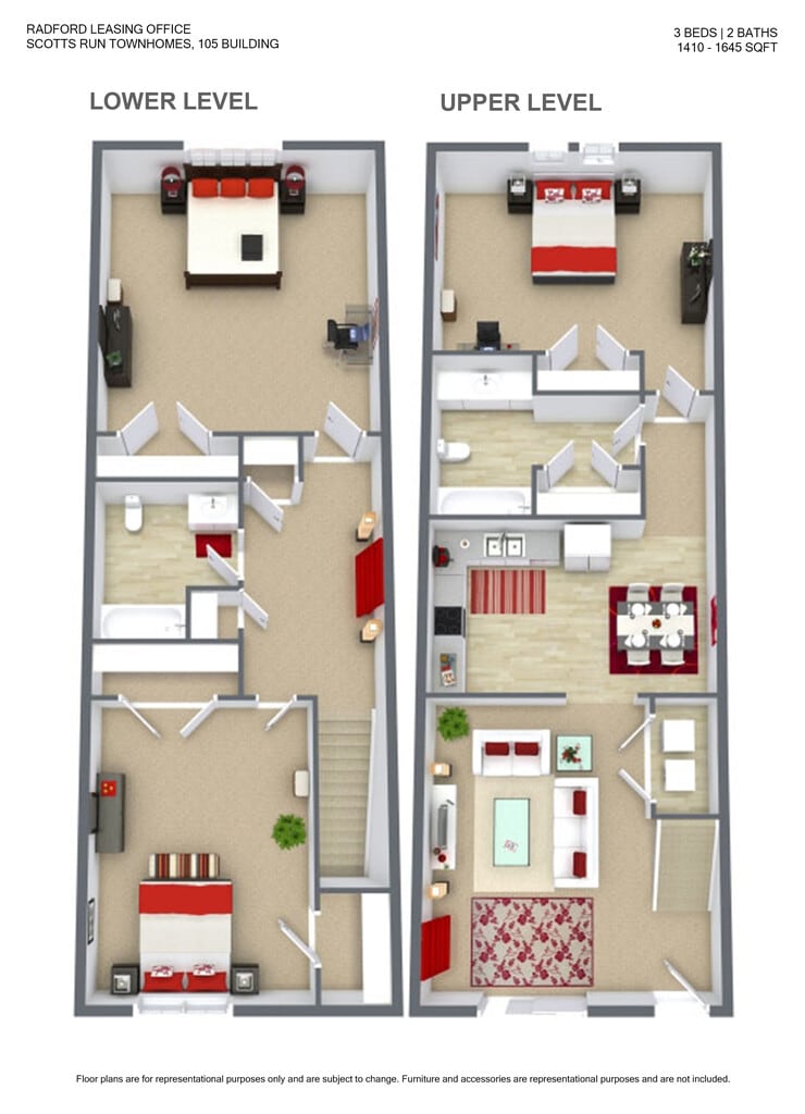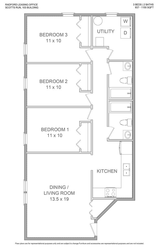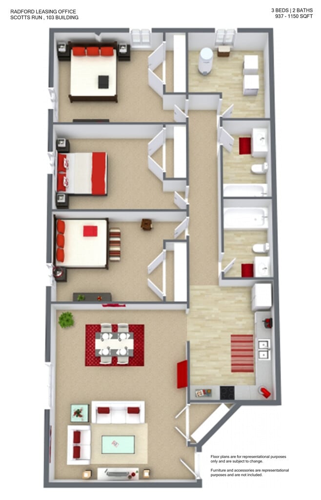 Scott's Run Apartments & Townhomes offers 3 Bedroom apartments starting from $409 and having 937–1,645 sq ft. Here is the current pricing and availability: