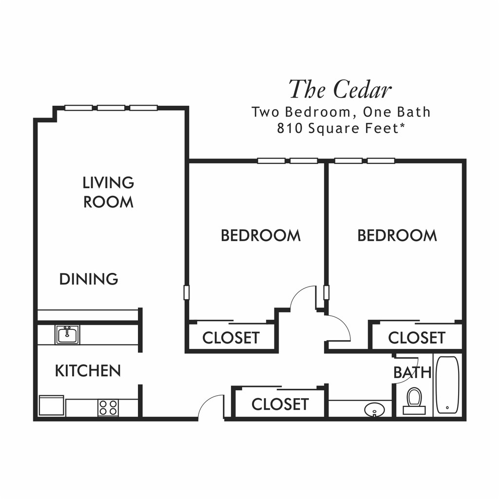 The Cedar - Floorplan 3 Apartment Unit: 033Apartment Model: The Cedar2 Bedroom, 1 Bath, 810 sq ftAvailable November 11, 2025Apartment Unit: 212Apartment Model: The Cedar2 Bedroom, 1 Bath, 810 sq ftAvailable November 25, 2025The Cypress