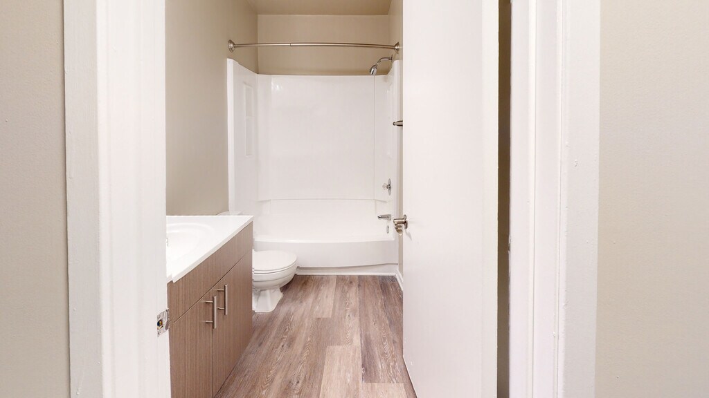 - Wood plank floors at entrance and kitchen