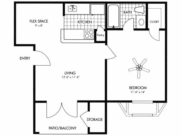 1x1 577 SF - Floorplan 2 Apartment Unit: 0114Apartment Model: 1x1 577 SF$7861 Bedroom, 1 Bath, 577 sq ftAvailable January 16, 20272 Bedrooms