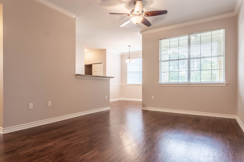 - Wide plank hardwood-like flooring