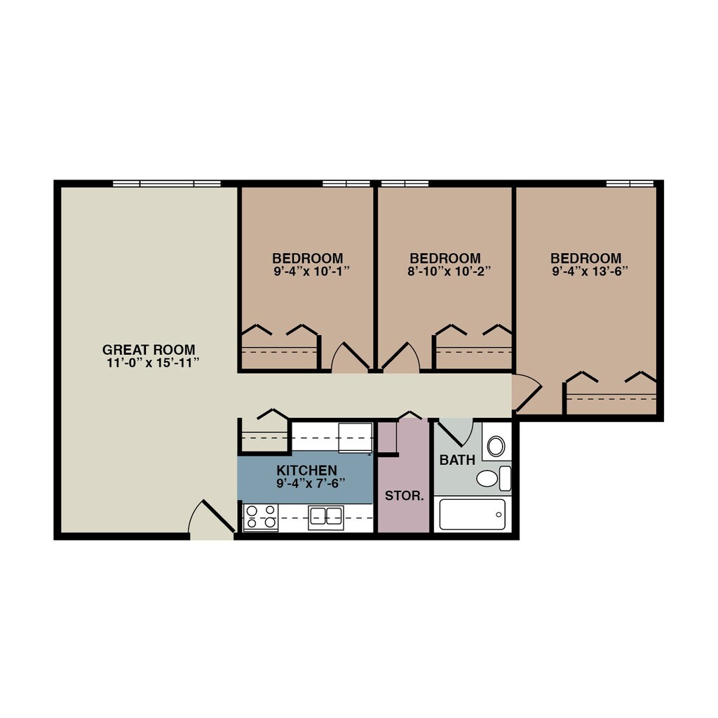 3A - Floorplan 2 Apartment Unit: 242Apartment Model: 3 Beds, 1 bath$1,5143 Bedroom, 1 Bath, 980 sq ftAvailable January 10, 2026