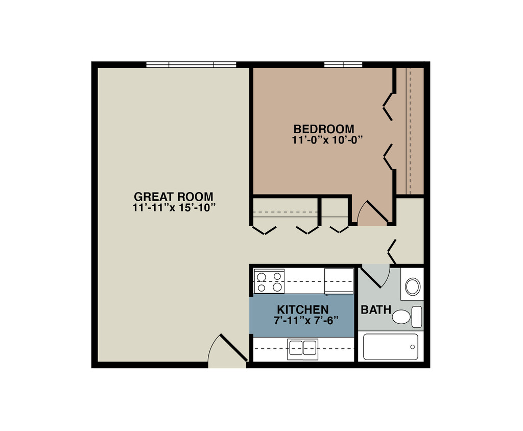 2A - Floorplan 1 Apartment Unit: 108Apartment Model: 2A$1,3442 Bedroom, 1 Bath, 840 sq ftAvailable NowFloorplan 2B
