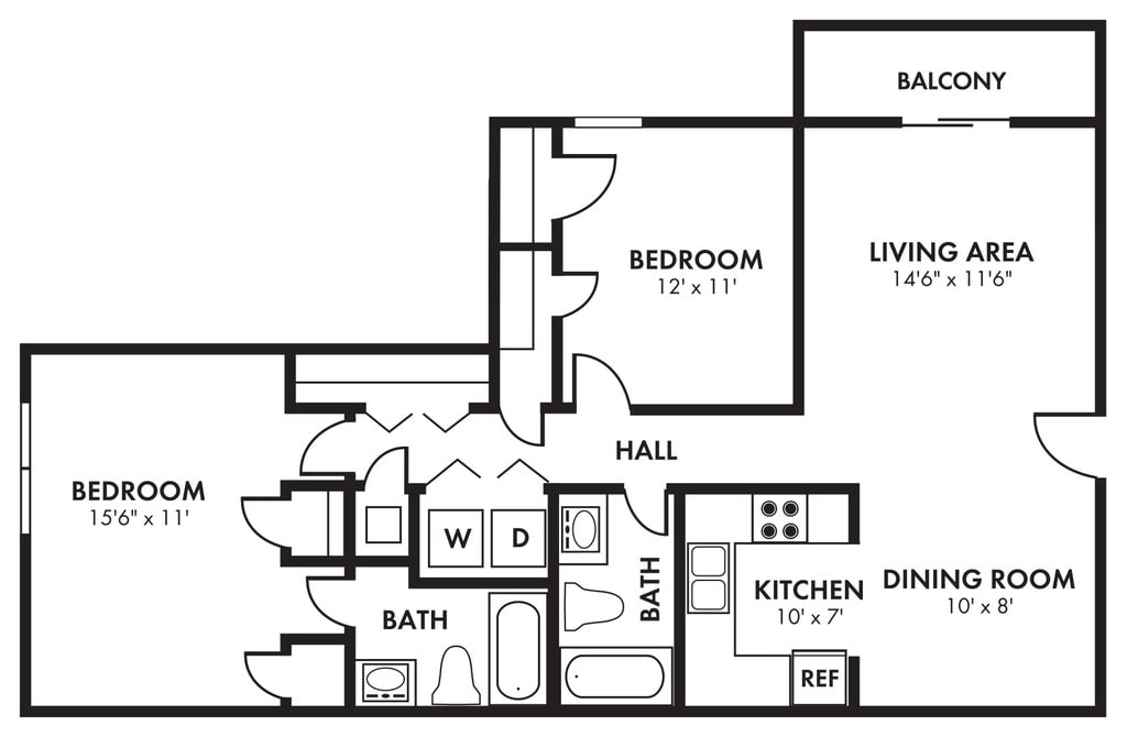 Apartment Model: Two Bedroom 2 BathFrom $1,3352 Bedroom, 2 Bath, 950 sq ftAvailable November 21, 2025FloorplansPhotos![]()