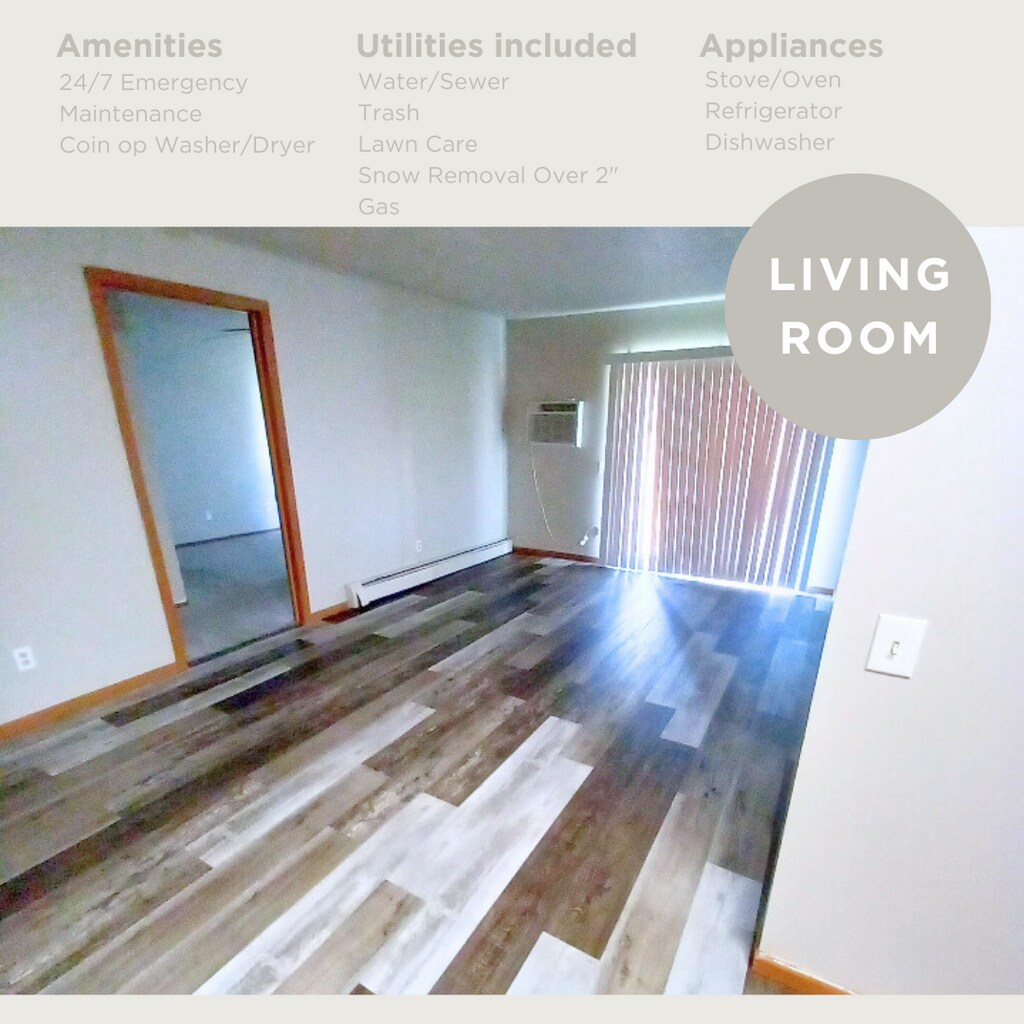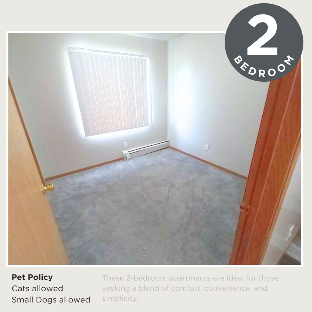 Comfortable Living in Our Cozy 2-Bedroom Apartments Welcome to your new home! Our 2-bedroom apartments offer a comfortable and practical living space, perfect for individuals or couples. These apartments are recently remodeled, ensuring a clean and well-maintained environment for all residents. Compact and Efficient: The layout of our apartments is designed for ease of living. The bedroom is cozy, providing a peaceful space for rest, while the living area is just right for everyday relaxation and dining. Modern Touches: Each apartment comes with essential modern amenities. The kitchen is equipped with up-to-date appliances, making meal preparation simple and enjoyable. The living spaces are uncluttered, offering a neat and tidy atmosphere. Clean and Well-Kept: We prioritize cleanliness and upkeep. You'll find the apartment in immaculate condition upon moving in, and our maintenance team is always on hand to ensure everything stays in top shape. Private Deck or Patio: Step outside to your own deck or patio, a perfect spot for relaxation, outdoor dining, or simply enjoying a breath of fresh air. These 2-bedroom apartments are ideal for those seeking a blend of comfort, convenience, and simplicity. *Rent rates and availability are subject to change. Images, 3D tours, and renderings of units may be similar to available units and do not necessarily represent the specific units available. Please contact the property for current rates and unit availability. Rental Terms Rent: $775 Security Deposit: $775 Pet Policy Cats allowed Small Dogs allowed Amenities 24/7 Emergency Maintenance Coin op Washer/Dryer Utilities included: Water/Sewer Gas Trash Lawn Care Snow Removal Over 2" Appliances Stove/Oven Refrigerator Dishwasher