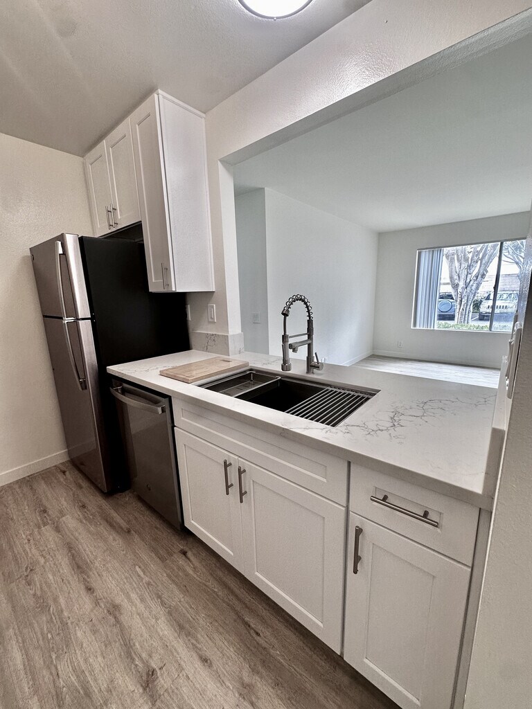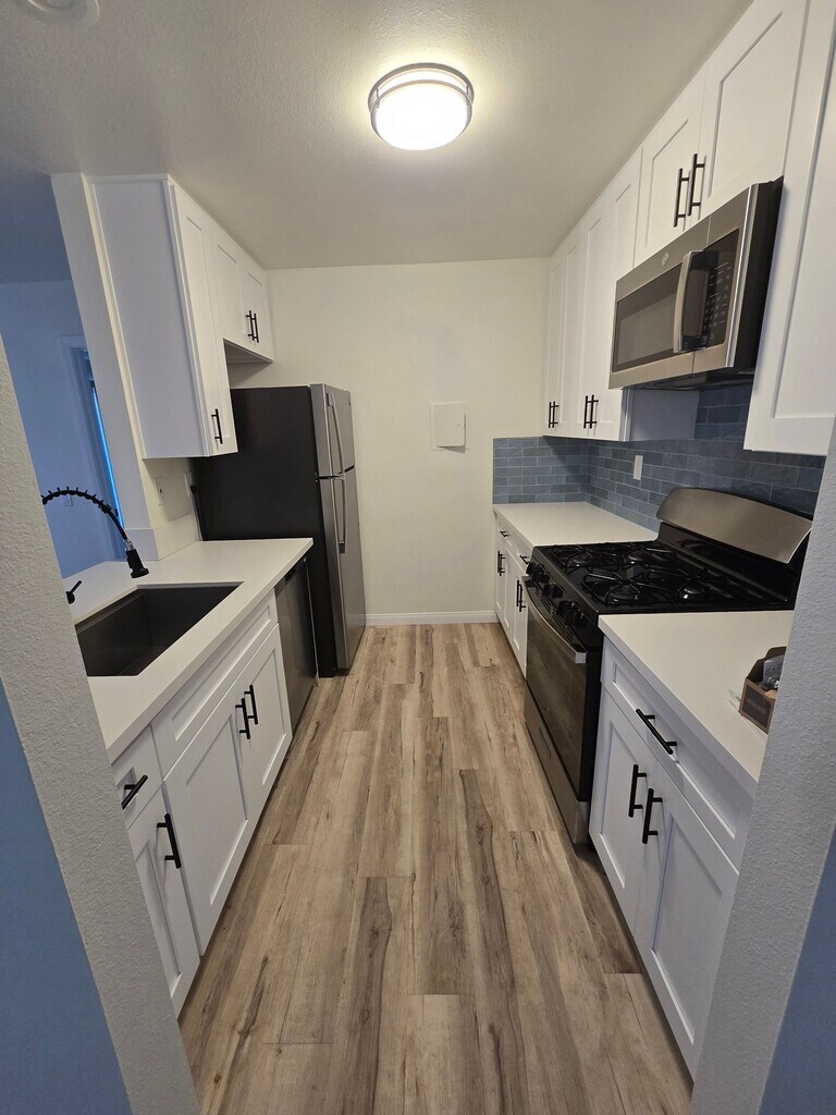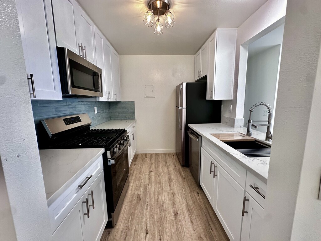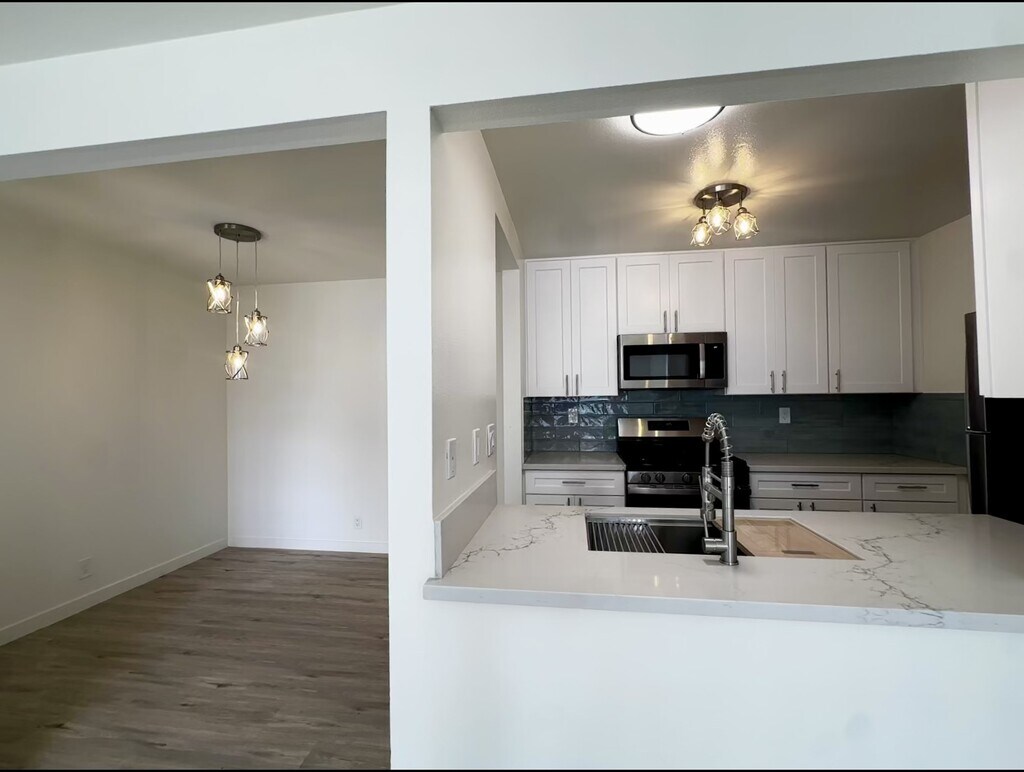 Step into a beautifully remodeled one-bedroom, designed with comfort and style in mind. The living room features recessed lighting and an open layout, leading to a modern kitchen with quartz countertops, white cabinetry, a deep sink with a black faucet, and stainless steel appliances. A statement dining room chandelier adds elegance, while the bathroom offers a rain showerhead and updated finishes for a spa-like feel.
