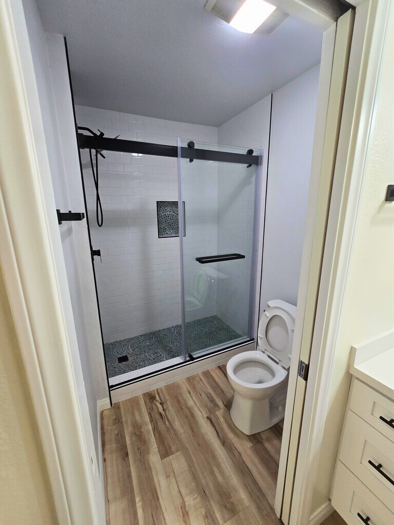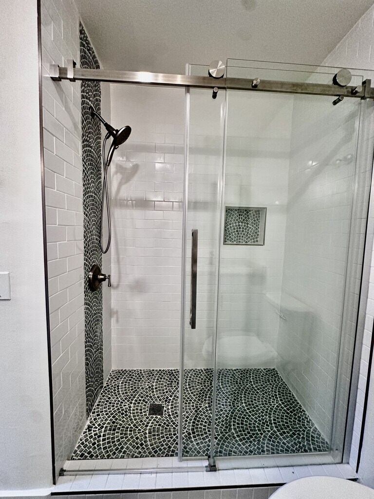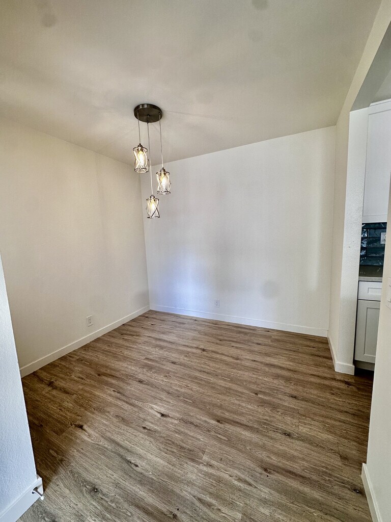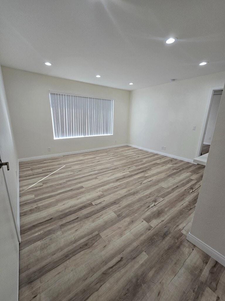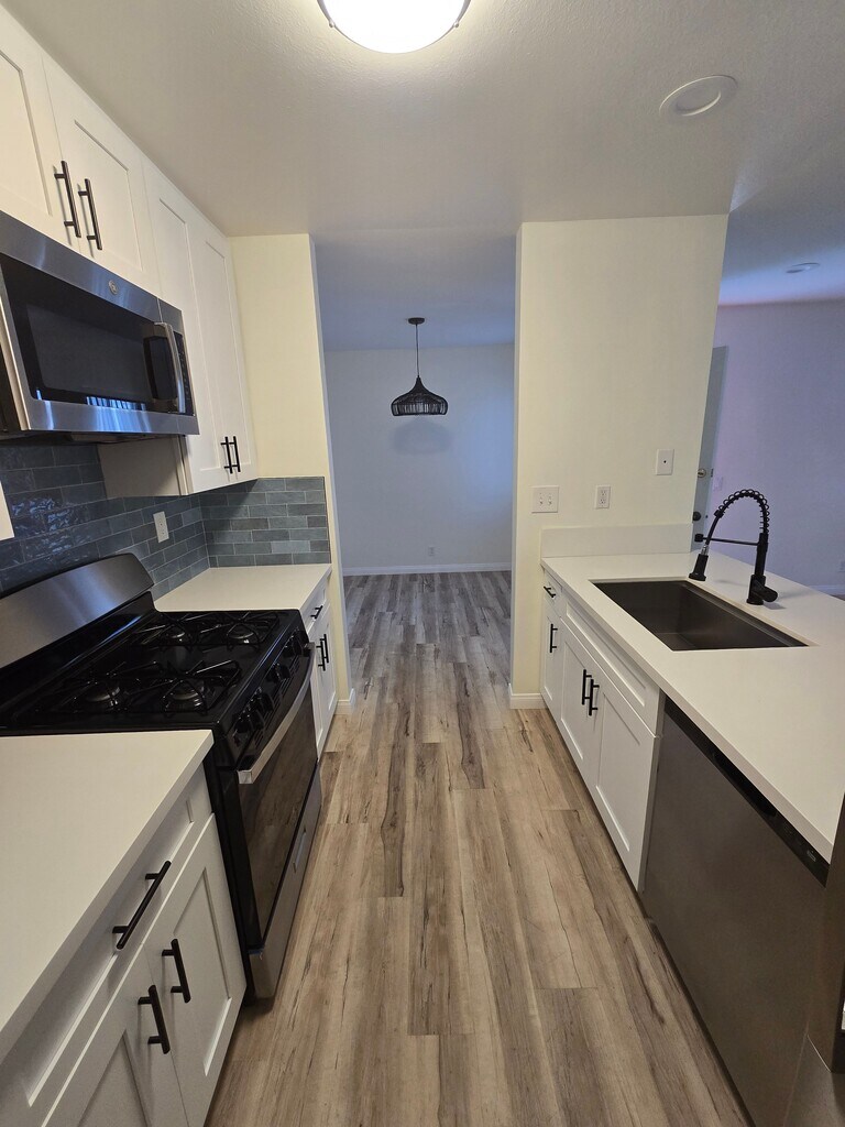 Step into a beautifully remodeled one-bedroom, designed with comfort and style in mind. The living room features recessed lighting and an open layout, leading to a modern kitchen with quartz countertops, white cabinetry, a deep sink with a black faucet, and stainless steel appliances. A statement dining room chandelier adds elegance, while the bathroom offers a rain showerhead and updated finishes for a spa-like feel.