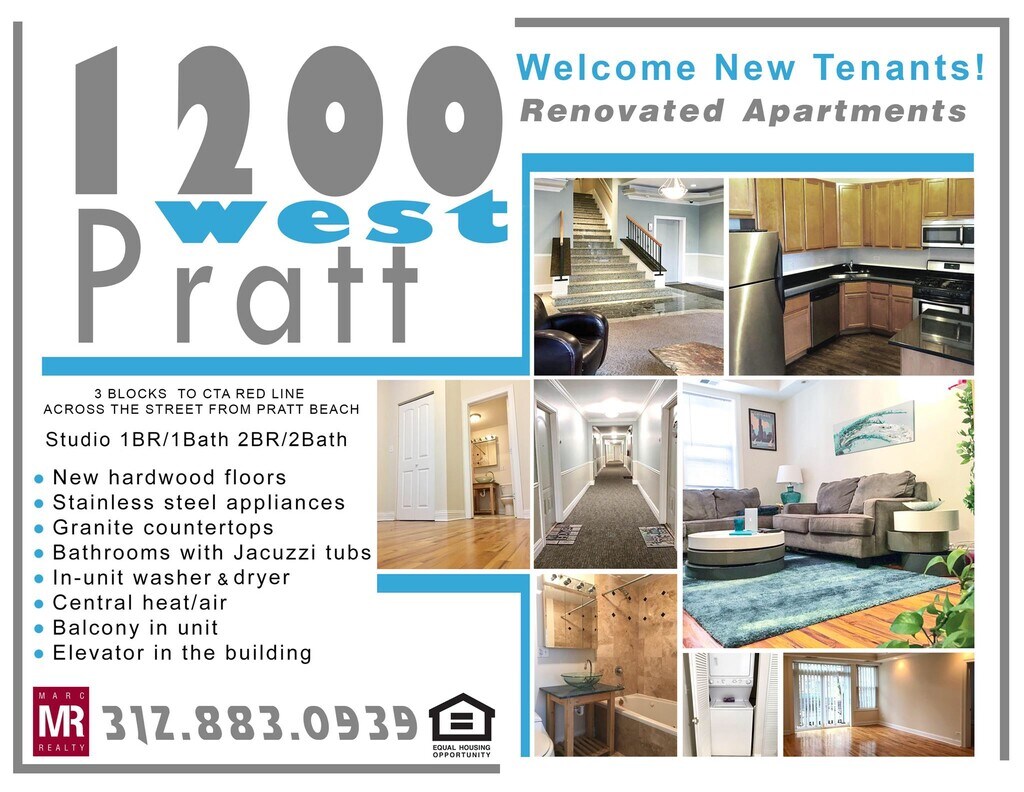 1200 W Pratt Blvd. RENOVATED APARTMENTS! TO QUALIFY CREDIT SHOULD BE 650 OR MORE AND INCOME SHOULD BE 3 TIMES THE RENT BEFORE TAXES! -3 blocks to CTA RED LINE -1 block away from beach * HARDWOOD FLOORS * STAINLESS STEEL APPLIANCES * GRANITE COUNTERTOPS * BATHROOMS WITH JACUZZI TUBS * IN UNIT WASHER/DRYER * CENTRAL HEAT/AIR * BALCONY IN SOME UNITS *ELEVATOR IN THE BUILDING FEES: APPLICATION FEE IS $75.00 PER PERSON MONTHLY PET FEE IS $30.00 NON REFUNDABLE MOVE IN PET FEE IS $300.00 SMALL STORAGE LOCKER IS $25.00 A MONTH LARGE STORAGE LOCKER IS $50.00 A MONTH