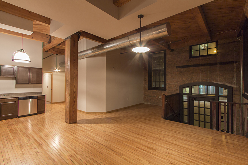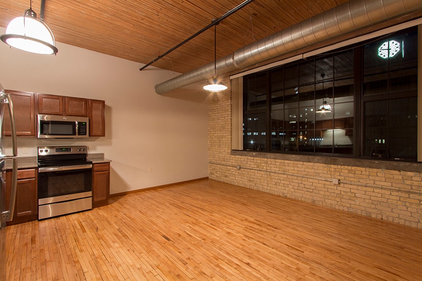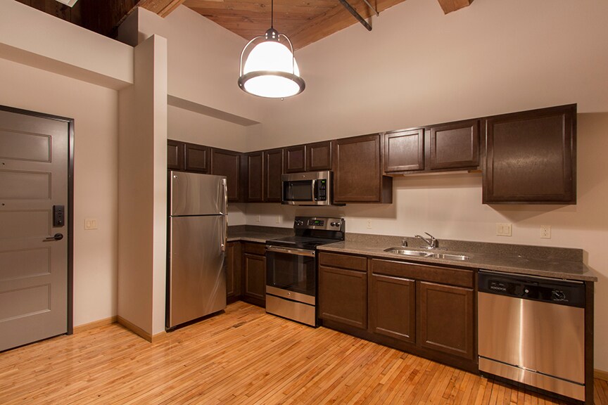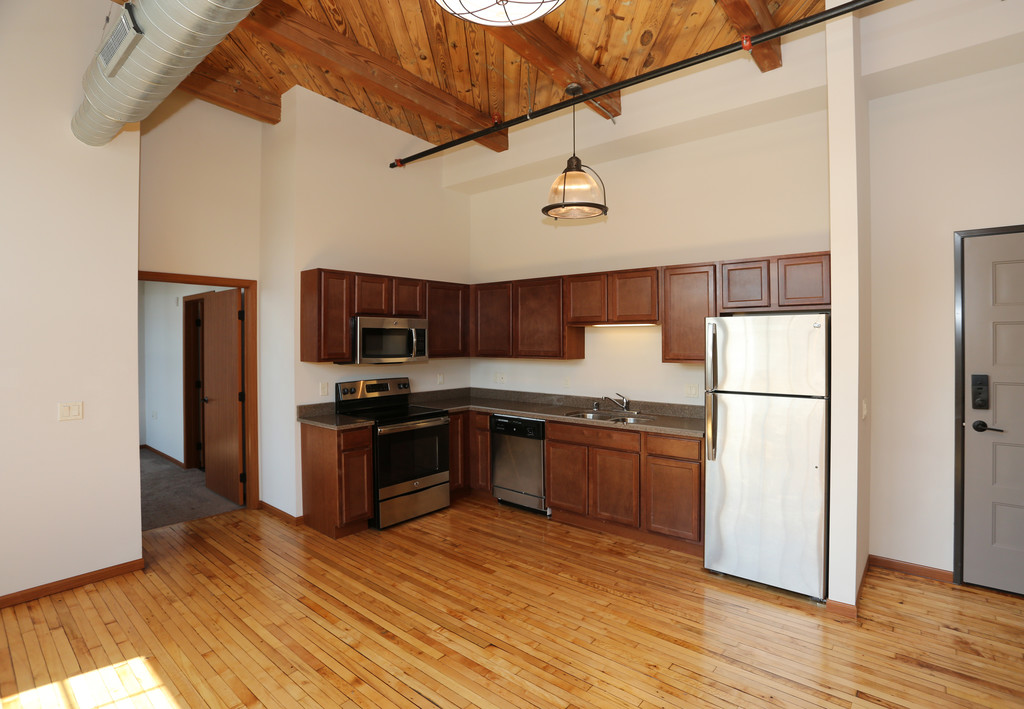 These spacious loft floor-plans feature over sized windows, beautifully finished reclaimed hardwood flooring, exposed brick walls and tall, open ceilings and individual gas forced air heat and central air. Kitchens contain modern cabinetry, stainless steel appliances and granite counter-tops. Every apartment includes a washer and dryer for added convenience as well as access to our business center and fitness center! Surface lot parking is available to rent. Our community also accepts one cat or dog (50lbs. or under) per apartment with a one-time deposit of $300 and $25 monthly pet rent! Restrictions may apply.