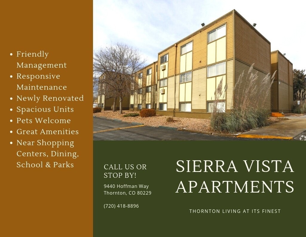 Sierra Vista - 2023 Specials on our Newly Renovated apartment homes! is located in the Greater Thornton Neighborhood and 80229 Zip code of Thornton, CO. This community is professionally managed by Jaaso Property Management LLC
