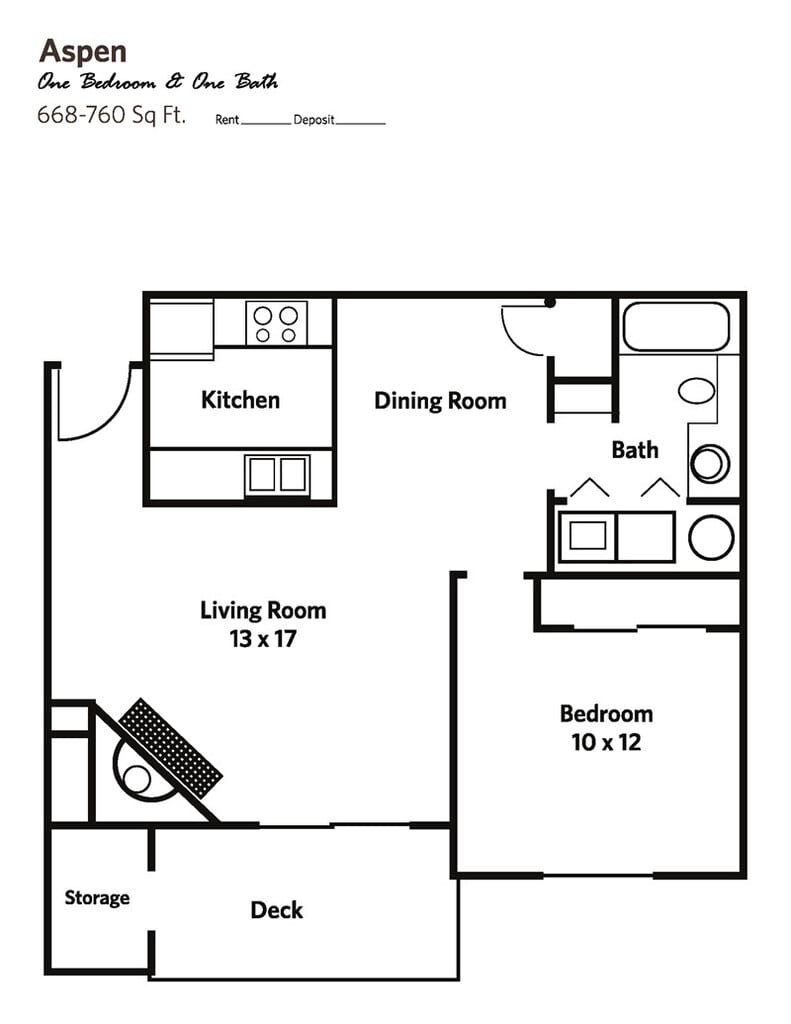 Apartment Model: Aspen SmallFrom $1,6501 Bedroom, 1 Bath, 668 sq ftAvailable November 22, 2025Aspen Small - Floorplan 1 Aspen Large