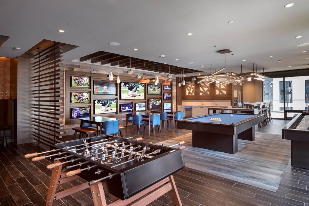 - Social clubroom with HDTV sports wall, kitchen, billiards, shuffleboard, and foosball