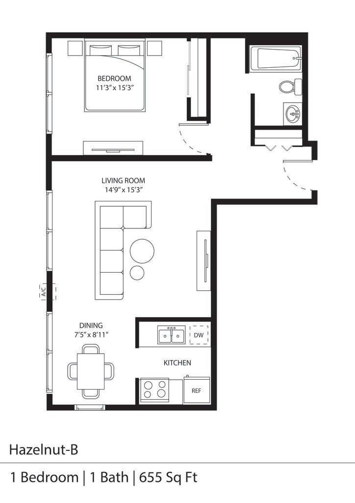 Hazelnut - Floorplan 2 Apartment Unit: 20-204Apartment Model: Hazelnut$1,2591 Bedroom, 1 Bath, 655 sq ftAvailable December 30, 20252 Bedrooms
