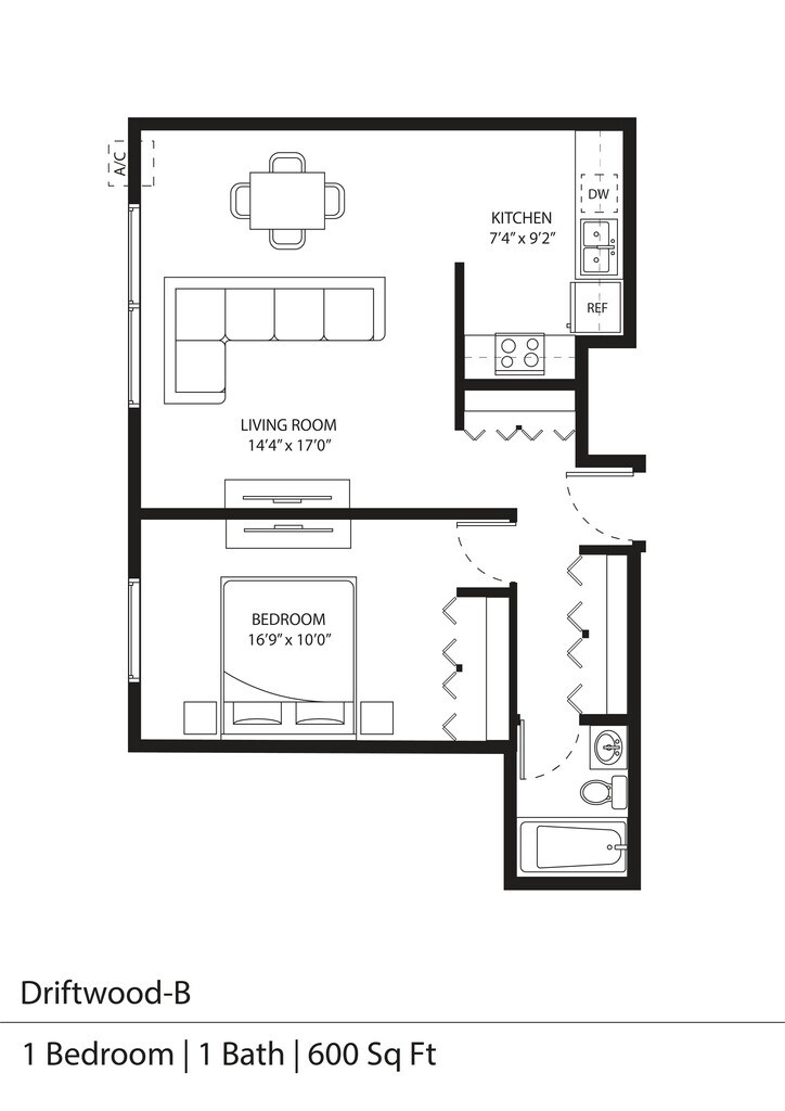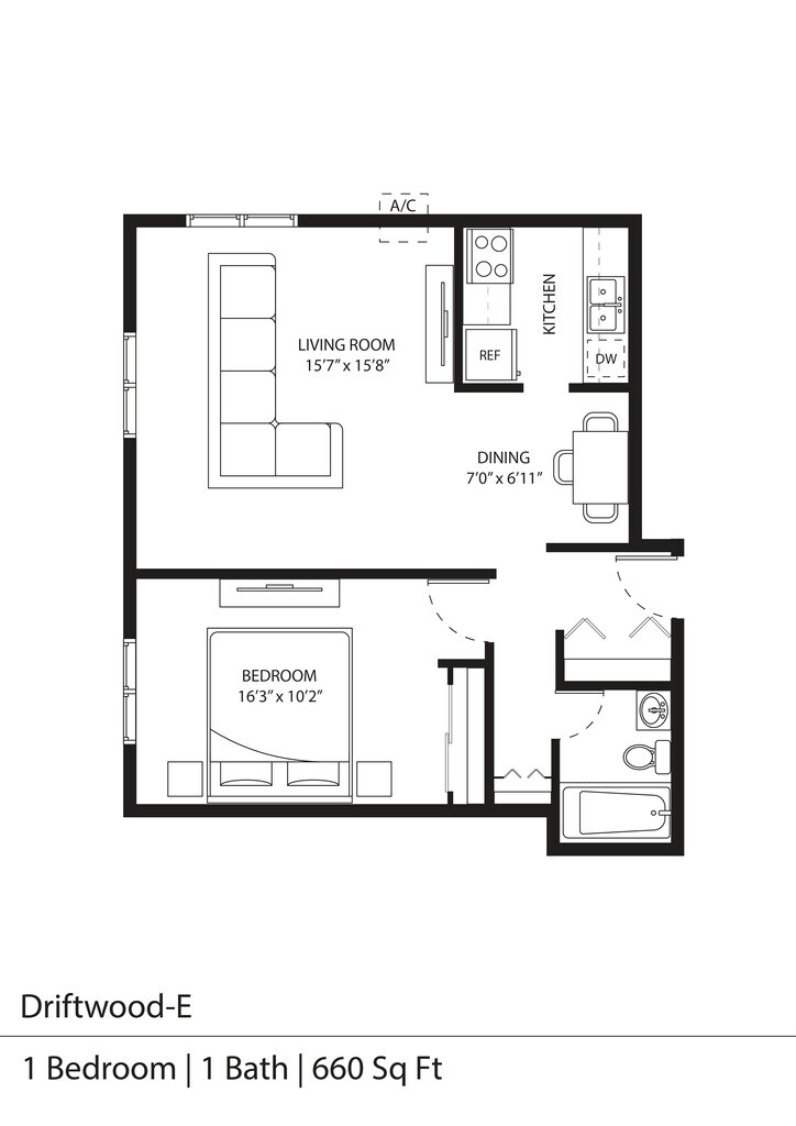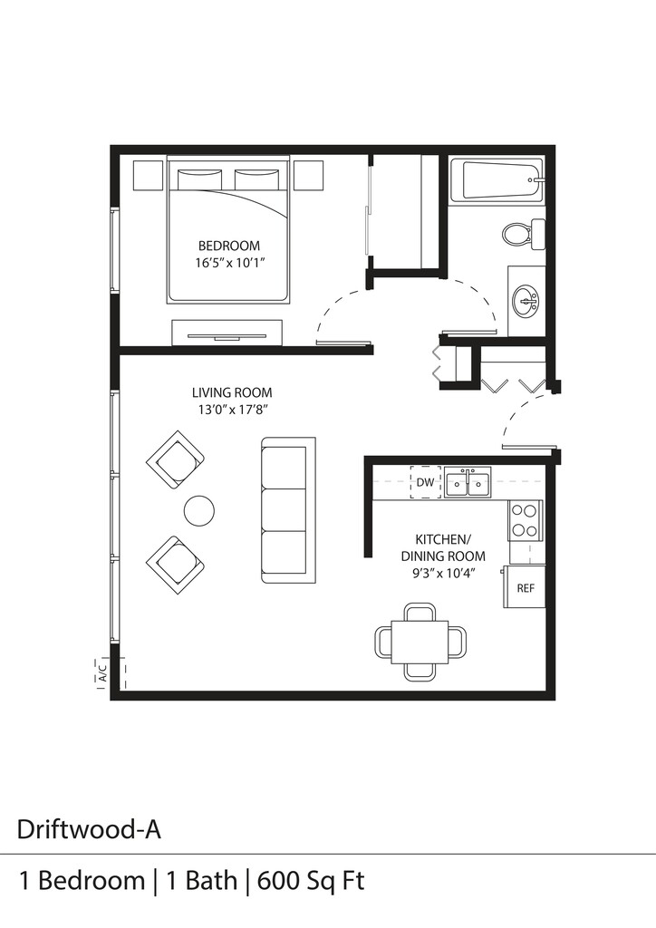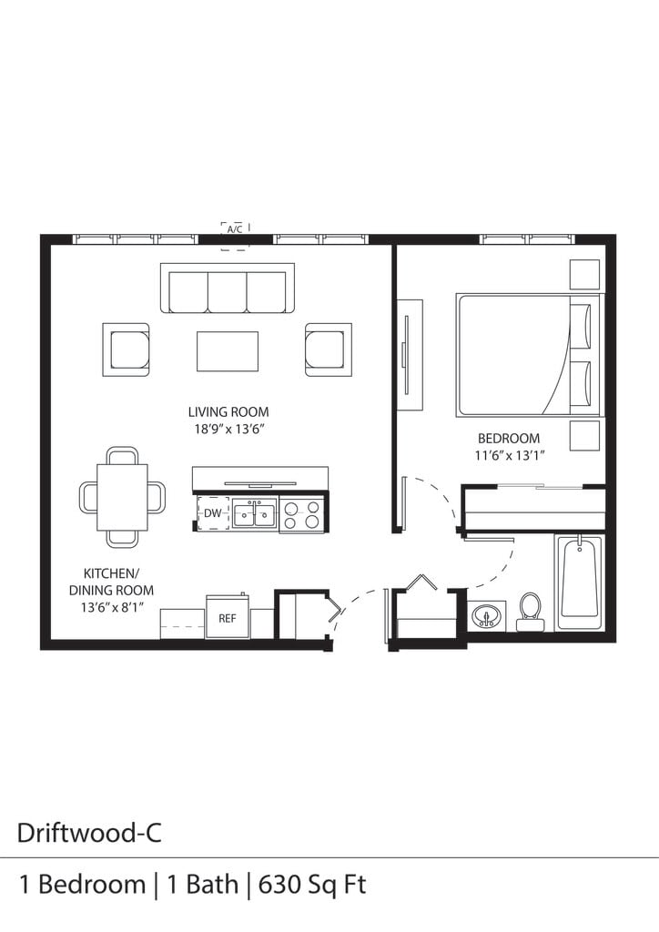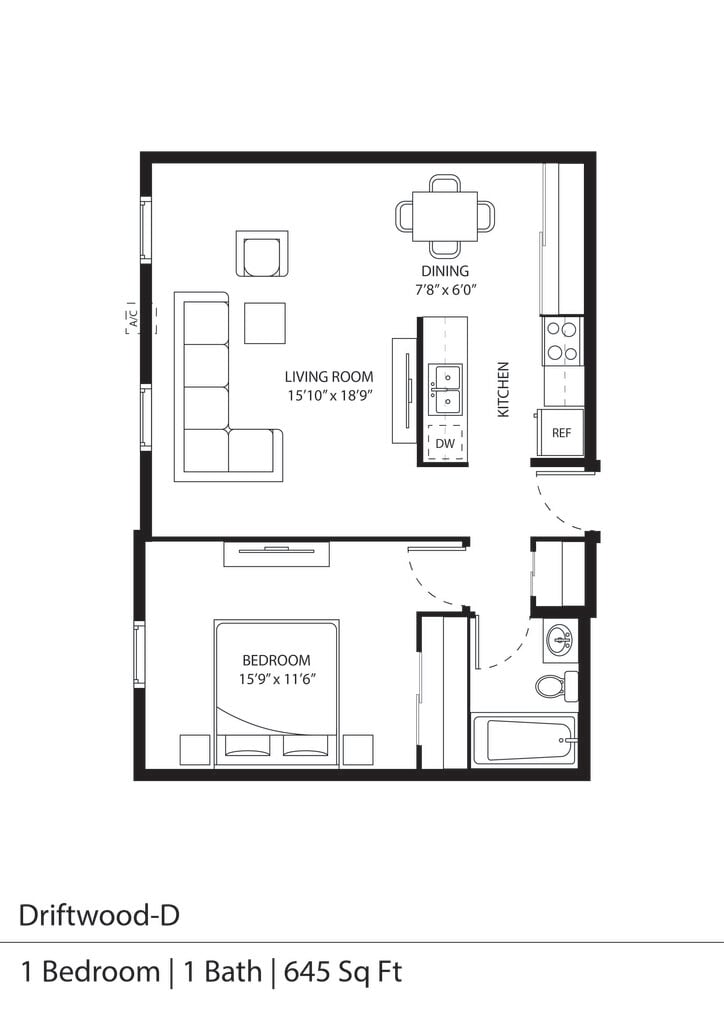 Apartment Model: DriftwoodFrom $1,2291 Bedroom, 1 Bath, 600-650 sq ftAvailable November 5, 2025![]()
