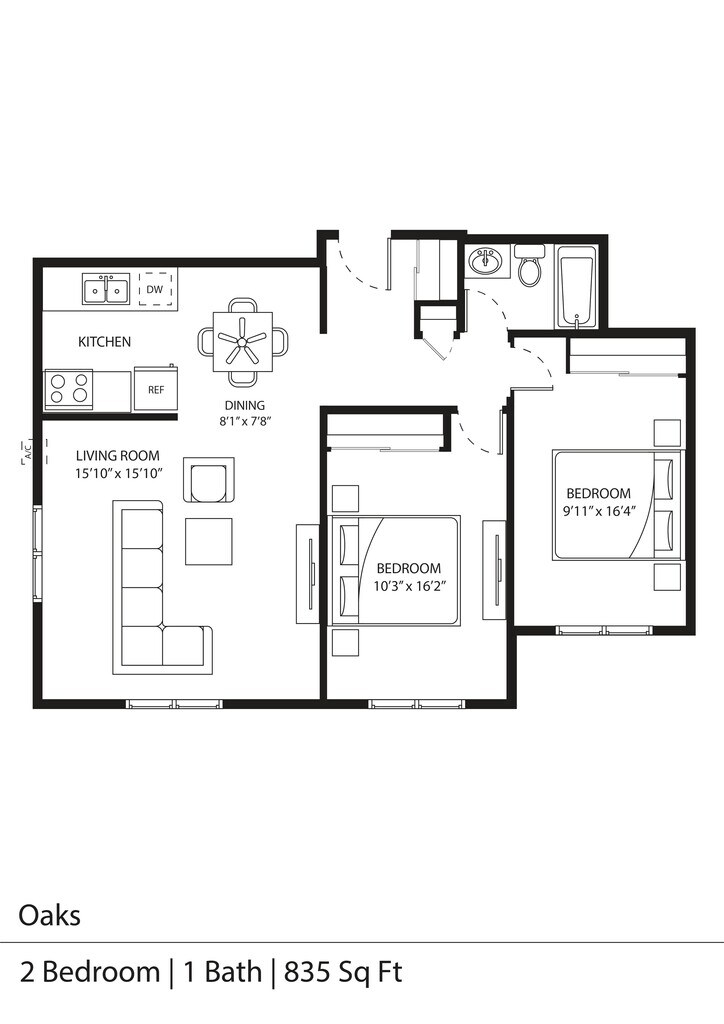 Apartment Model: OaksFrom $1,4142 Bedroom, 1 Bath, 835 sq ftAvailable November 14, 2025![]()