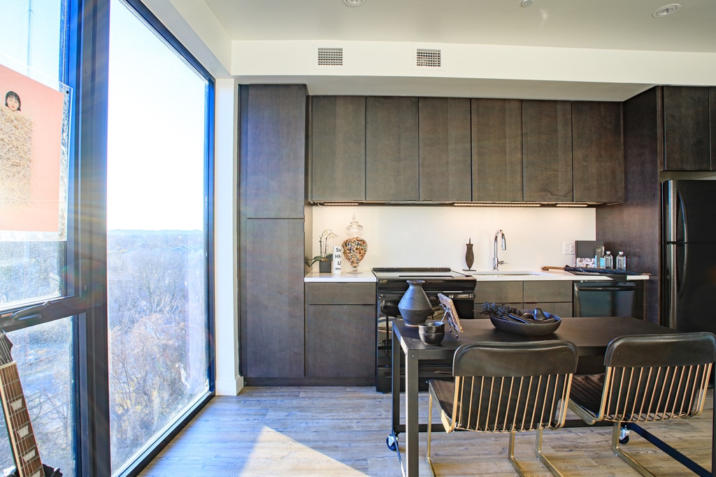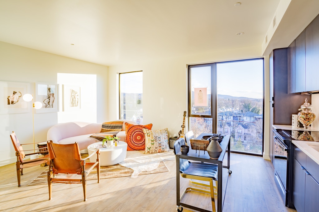 Thoughtfully designed residences to comfort and inspire. Pack the things that carry love and leave the rest behind. Floor to ceiling windows flood apartments with natural light, bringing inspiration inside. With unparalleled views across the Blue Ridge Mountains and Downtown Charlottesville, you can surround yourself with nature at the heart of the city. We’ve elevated the blank canvas, creating the perfect space for you to leave your own mark. With a grounding color palette, open floor plans and sophisticated design details in every unit, building your urban sanctuary has never been easier. Designed to deliver equal portions of sophistication and functionality, our kitchens were built for entertaining. With custom black matte cabinetry, clean lines, and innovative design concepts, you’ll feel right at home.