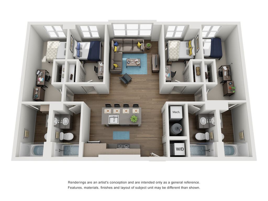 Apartment Model: 4 Bedroom 4 Bathroom AFrom $1,6494 Bedroom, 4 Bath, 1345 sq ftAvailable Now![]() - 4 Bedroom 4 Bathroom A - Floorplan 1